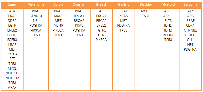 產(chǎn)品特性: 1. 樣本來(lái)源于臨床分離建立的細(xì)胞系,非常接近臨床病人的特性; 2. 泛癌種,涉及多種腫瘤相關(guān)的基因:肺癌、乳腺癌、結(jié)直腸癌、胰腺癌、血液腫瘤、胃癌等等,部分基因羅列如下: