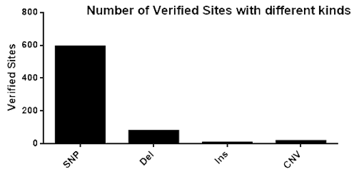 圖1. 在不同染色體編號(hào)上的位點(diǎn)數(shù)(經(jīng)過(guò)驗(yàn)證的位點(diǎn)) 4. 變異種類多:涉及SNP,deletion,insertion,CNV等等;