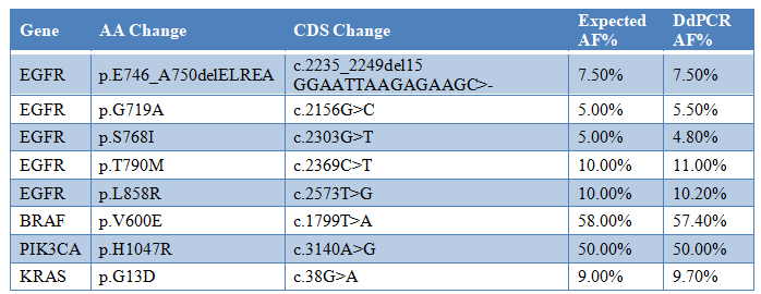 表2. 16個(gè)經(jīng)過(guò)1000x NGS-Panel試劑盒驗(yàn)證的位點(diǎn)信息 8.2 DdPCR驗(yàn)證8個(gè)位點(diǎn),Bio-Rad QX200和Bio-Rad原裝試劑