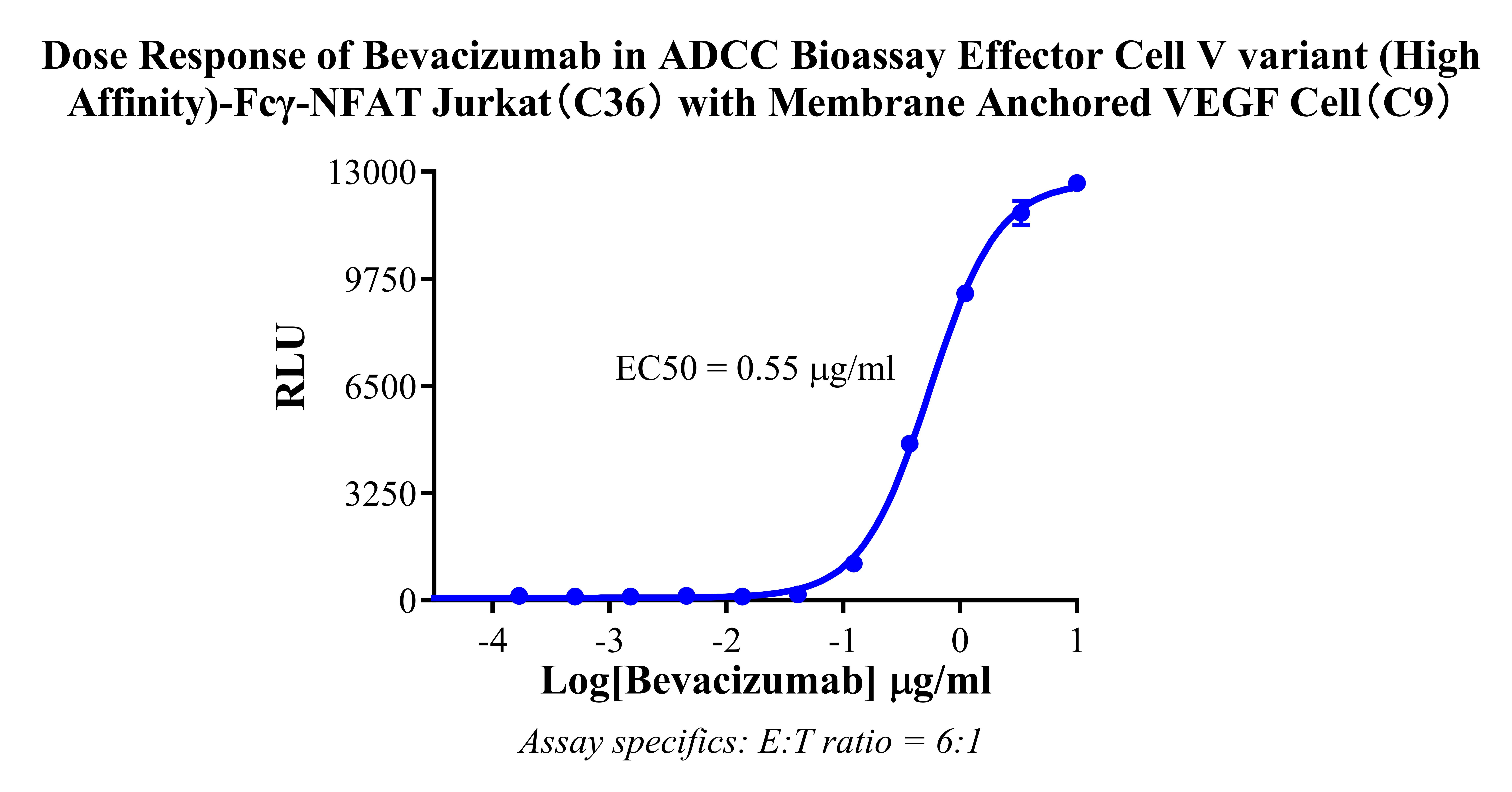 Figure 2. Dose Response of Bevacizumab in ADCC Bioassay Effector Cell V variant (High Affinity)-Fcγ-NFAT Jurkat(C36) with Membrane Anchored VEGF Cell(C9). |
