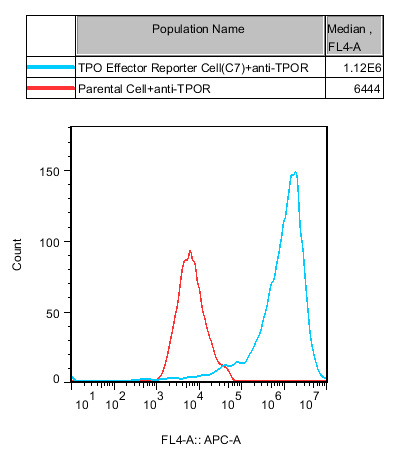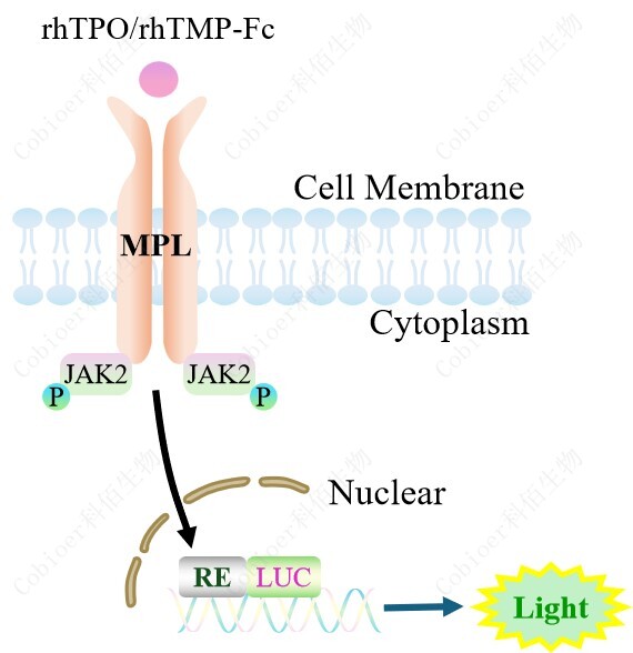TPO Effector Reporter Cell 報告基因藥靶模型很好的模擬了體內(nèi) TPO 的信號轉(zhuǎn)導(dǎo)過程, 原理見下圖所示。![]() Figure 1. TPO Effector Reporter Cell 細胞模型原理圖 |
