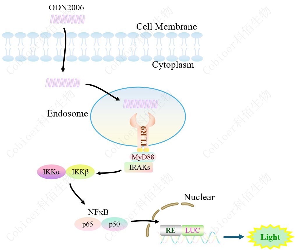 TLR9 NFκB-Luc HEK293 報(bào)告基因藥靶模型很好的模擬了體內(nèi) TLR9 的信號(hào)轉(zhuǎn)導(dǎo)過程, 原理見下圖所示。