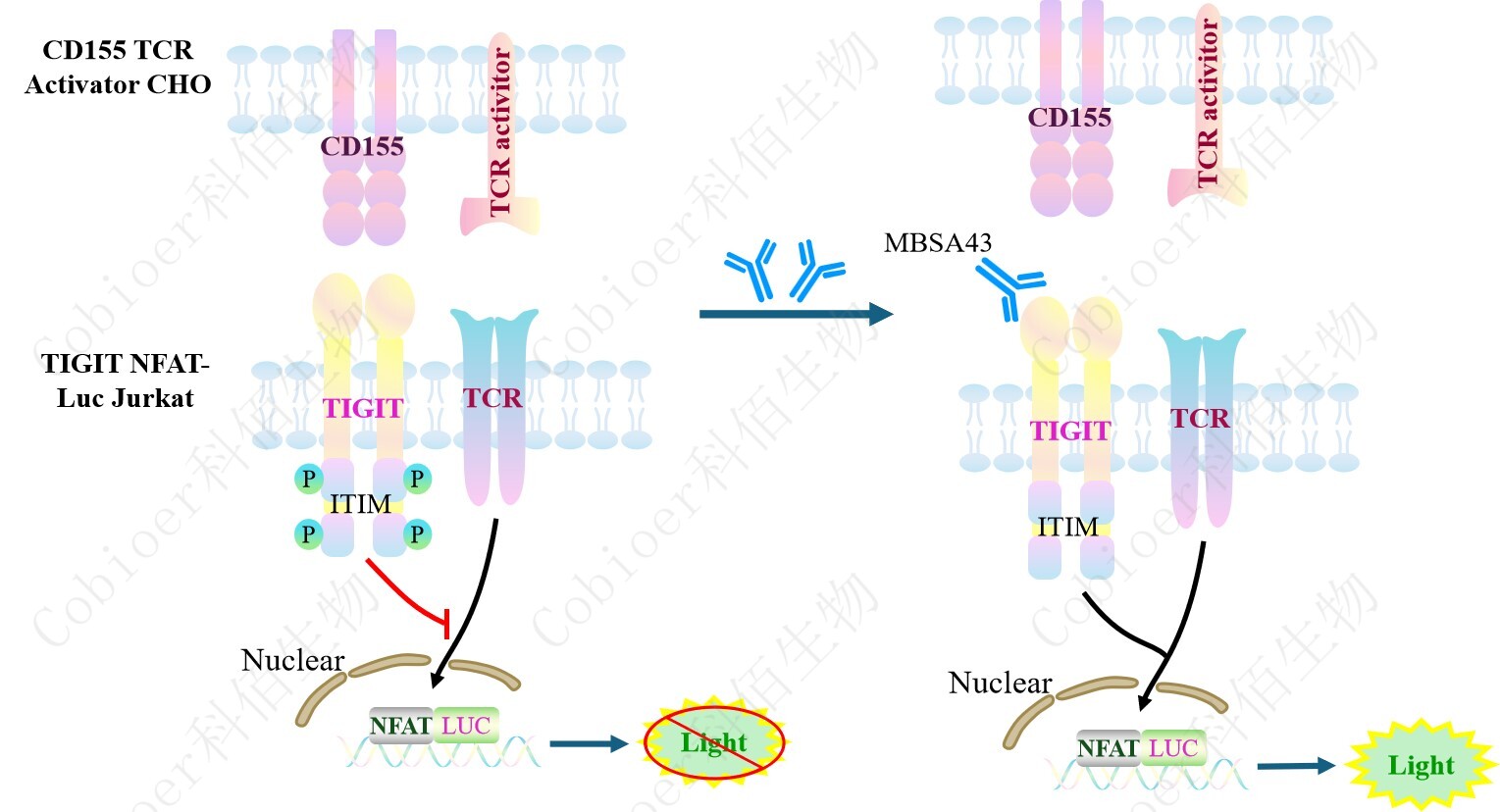 TIGIT NFAT-Luc Jurkat 報(bào)告基因藥靶模型很好的模擬了體內(nèi) TIGIT 的信號(hào)轉(zhuǎn)導(dǎo)過程, 原理見下圖所示。
