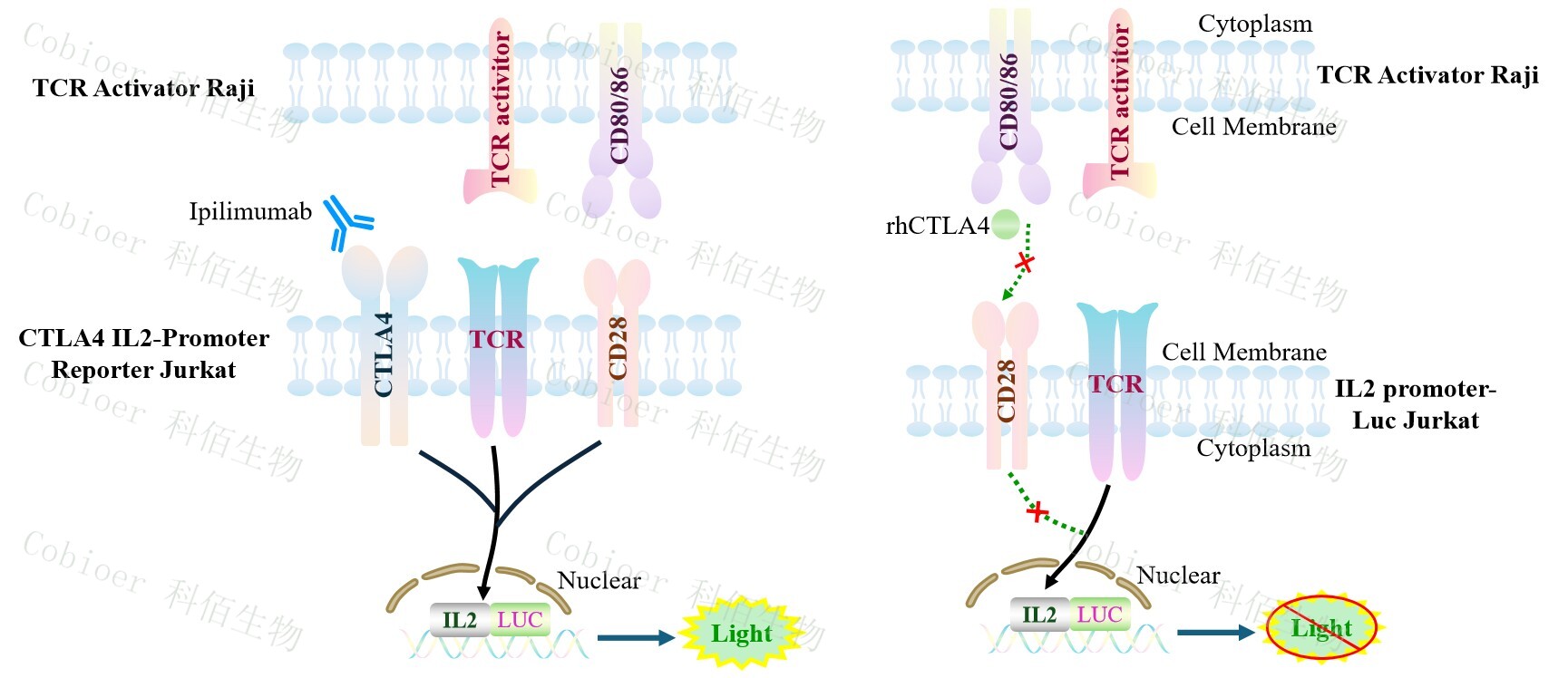 TCR Activator Raji 報告基因藥靶模型很好的模擬了體內(nèi) CD28&CD80/CD86 或者CTLA4 的信號轉(zhuǎn)導(dǎo)過程,原理見下圖所示。![]() Figure 1. TCR Activator Raji 細(xì)胞模型原理圖 |