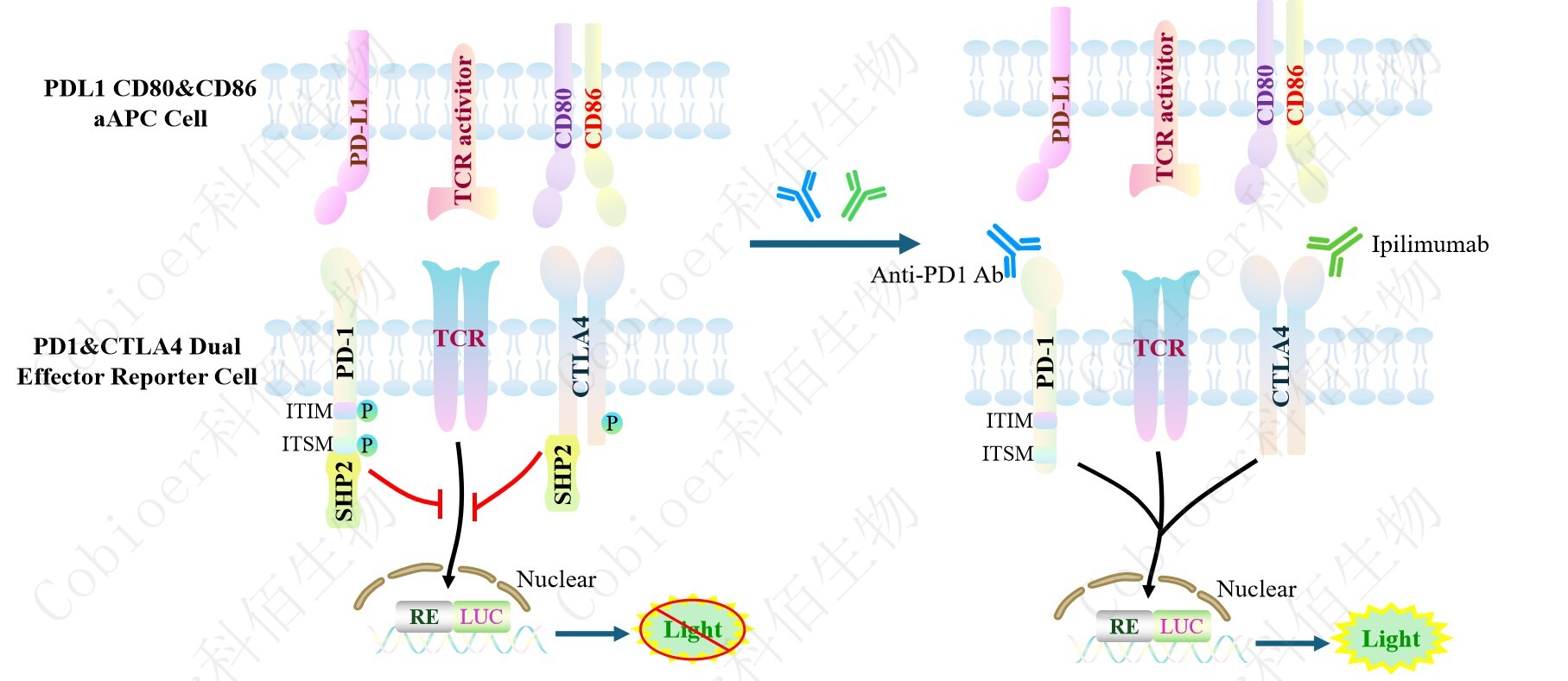 PD1&CTLA4 Dual Effector Reporter Cell 報 告 基 因 藥 靶 模 型 很 好 的 模 擬 了 體 內(nèi) PD1&CTLA4 的信號轉(zhuǎn)導過程,原理見下圖所示。