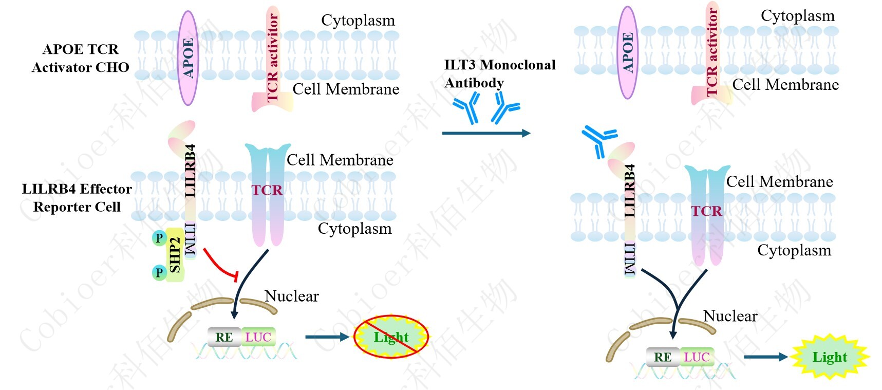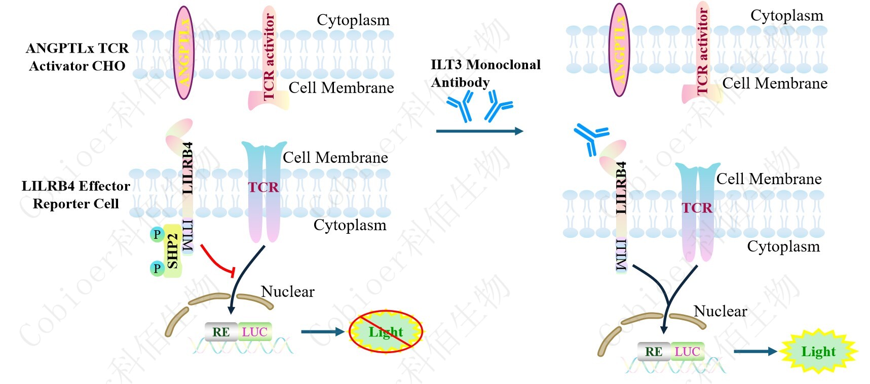 LILRB4 Effector Reporter Cell 報告基因藥靶模型很好的模擬了體內(nèi) LILRB4 的信號轉(zhuǎn) 導(dǎo)過程,原理見下圖所示。![]() ![]() Figure 1. LILRB4 Effector Reporter Cell 模型原理圖