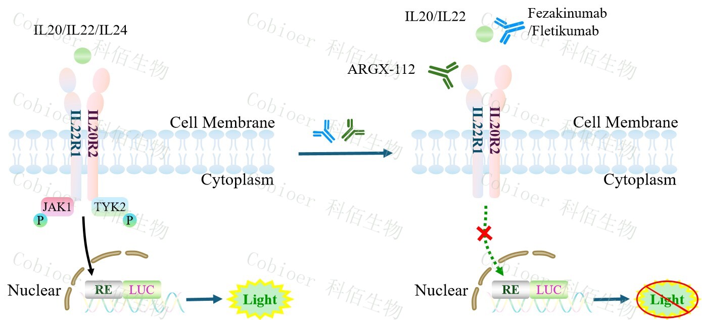 hIL20/IL22/IL24 Triple Effector Reporter Cell 報告基因藥靶模型很好的模擬了體內(nèi)IL20/IL22/IL24 的信號轉(zhuǎn)導(dǎo)過程,原理見下圖所示。