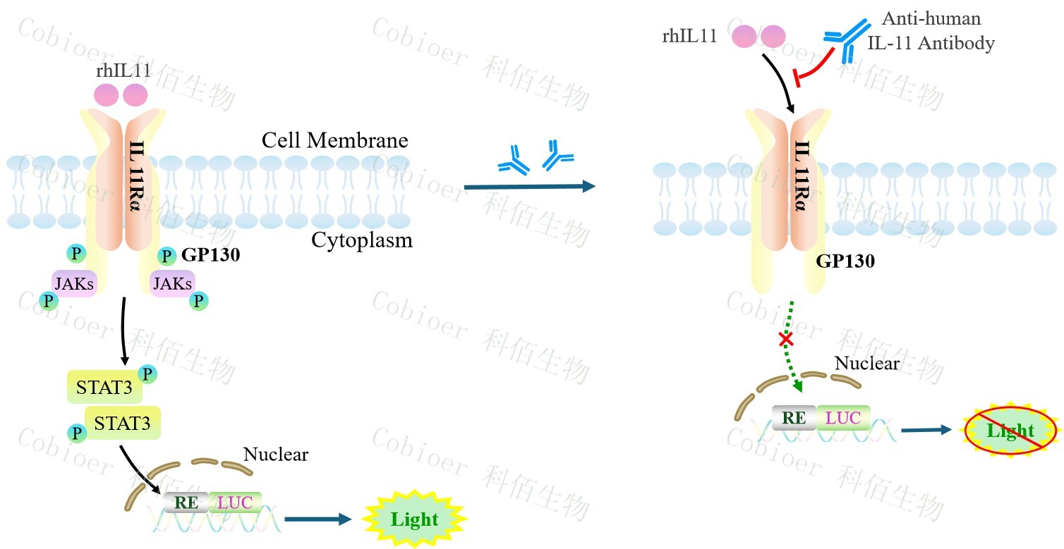 IL11 Effector Reporter Cell 報告基因藥靶模型很好的模擬了體內 IL11 的信號轉導過程, 原理見下圖所示。![]() Figure 1. IL11 Effector Reporter Cell 細胞模型原理圖 |