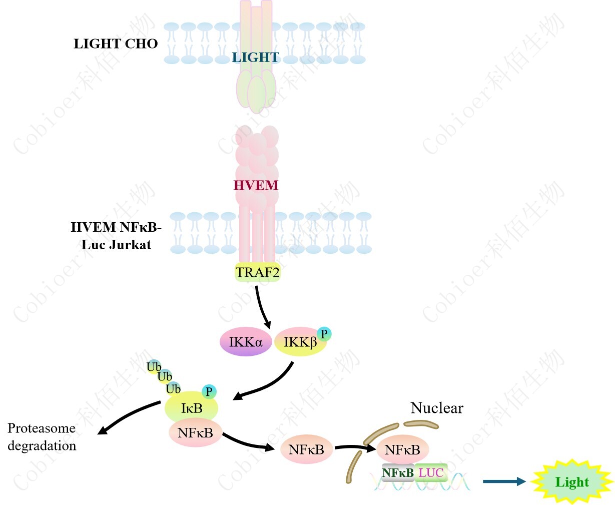 HVEM NFκB-Luc Jurkat 報告基因藥靶模型很好的模擬了體內 HVEM 的信號轉導過程, 原理見下圖所示。![]() Figure 1. HVEM NFκB-Luc Jurkat 細胞模型原理圖 |
