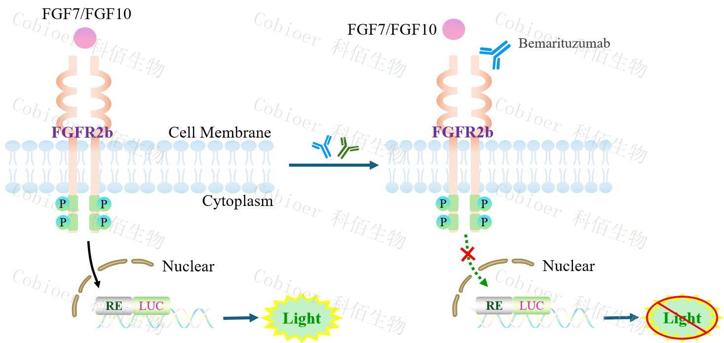 FGFR2b Effector Reporter Cell 報告基因藥靶模型很好的模擬了體內 FGFR2b 的信號轉 導過程,原理見圖 所示。![]() Figure 1. FGFR2b Effector Reporter Cell 細胞模型原理圖 |