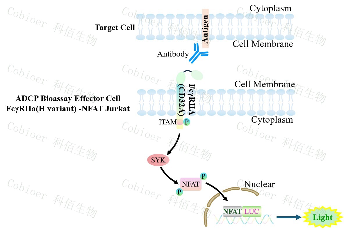 Figure 1. ADCP Bioassay Effector Cell FcγRIIa(H variant) -NFAT Jurkat 細胞模型原理圖