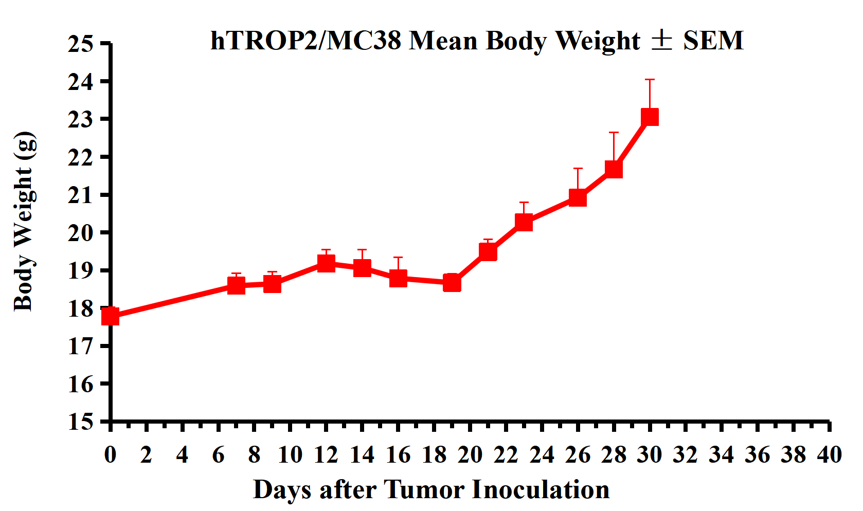 Figure 2. hTROP2/MC38 Mean Body Weight ± SEM.