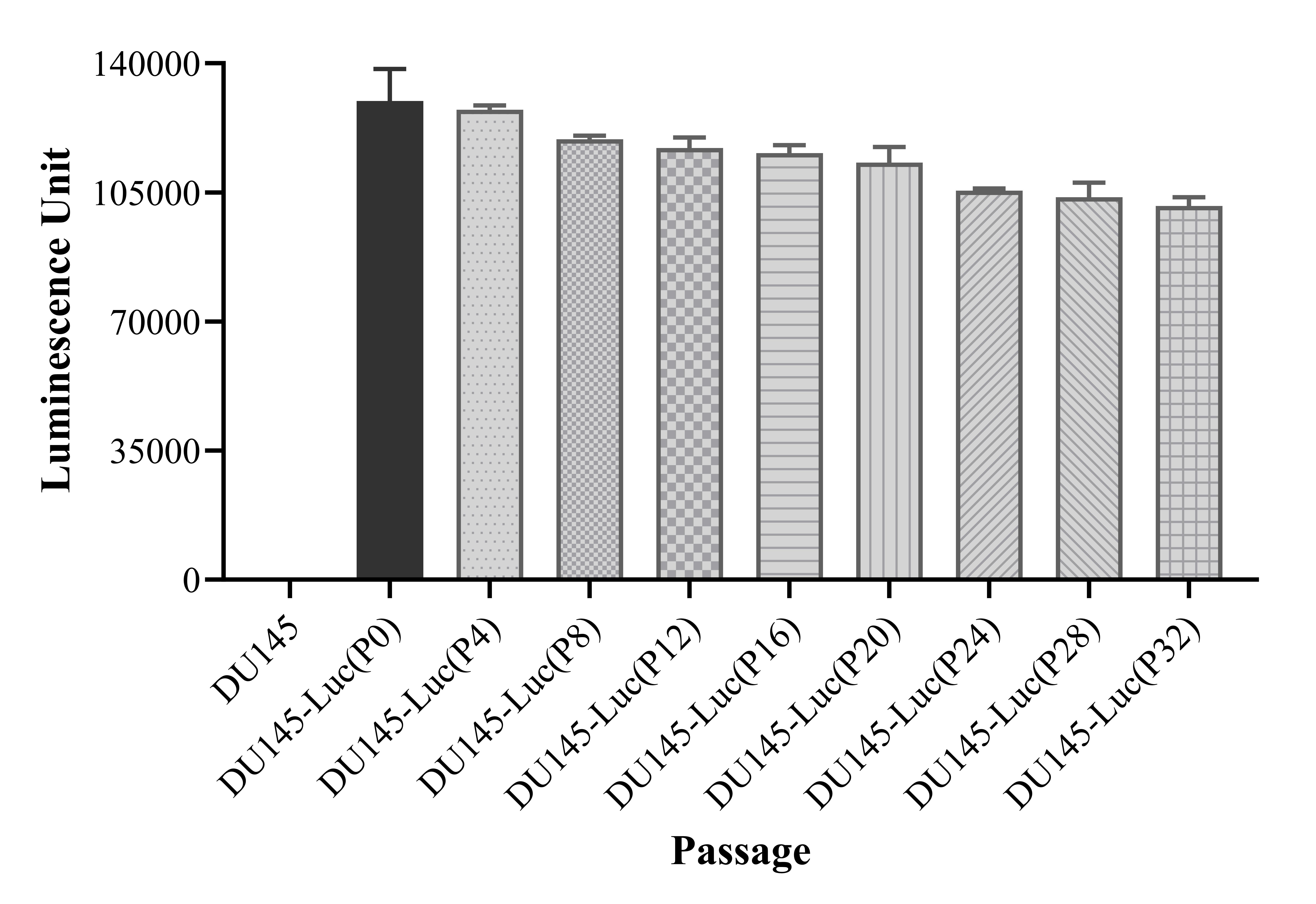 Figure 1. Stablity test results. DU145-Luc cell showed at least 32 passage stability with similar luminescence unit.