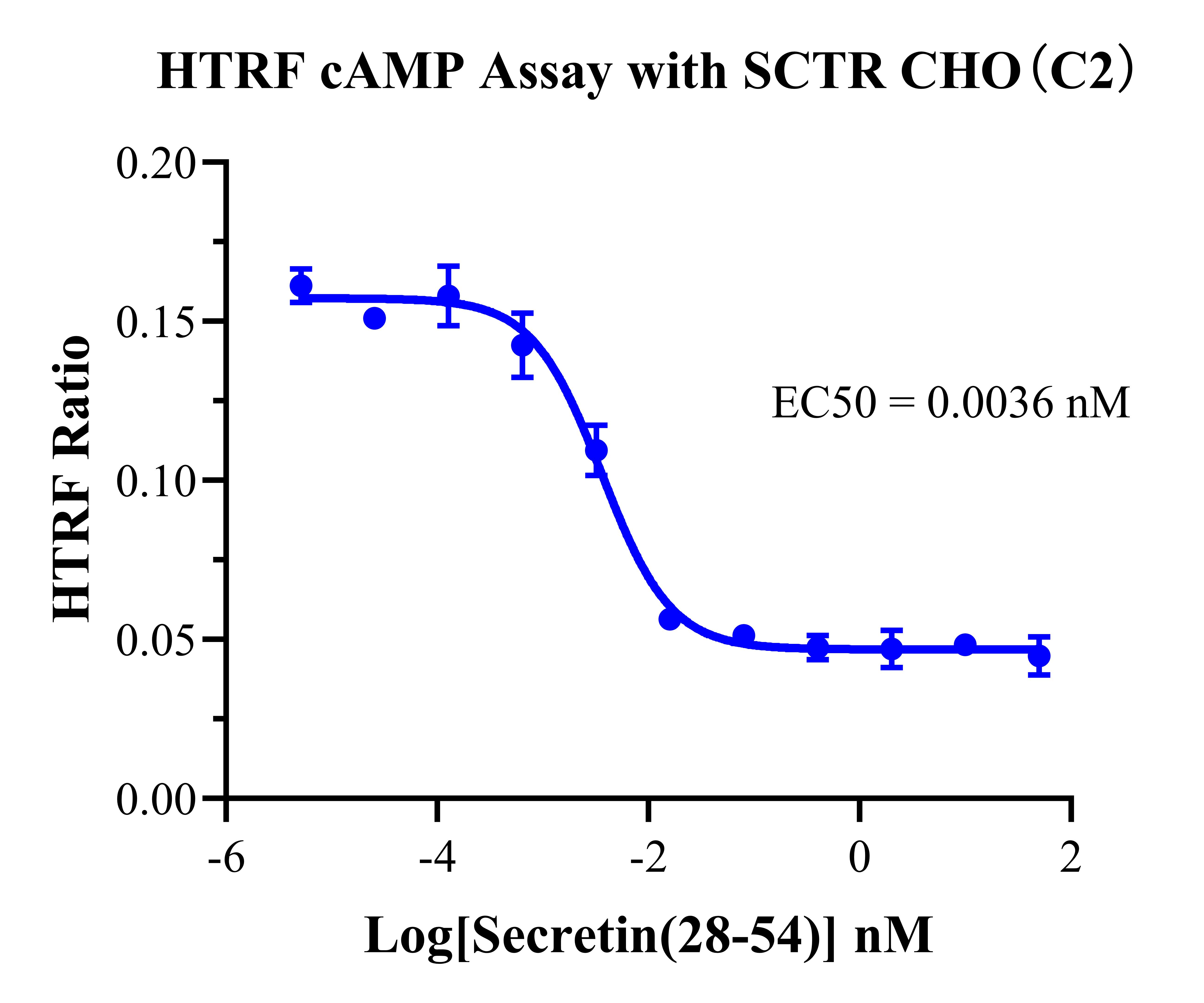cAMP 在 G 蛋白偶聯(lián)受體(GPCR)信號轉(zhuǎn)導(dǎo)中是一種關(guān)鍵的第二信使。當(dāng)配體結(jié)合到 GPCR, 構(gòu)象發(fā)生變化,激活受體接著激活 G 蛋白,Gs 的激活導(dǎo)致腺苷酸環(huán)化酶調(diào)控 cAMP 的升高。 SCTR 藥靶模型很好的模擬了體內(nèi) SCTR 的信號轉(zhuǎn)導(dǎo)過程,原理見下圖所示。 |