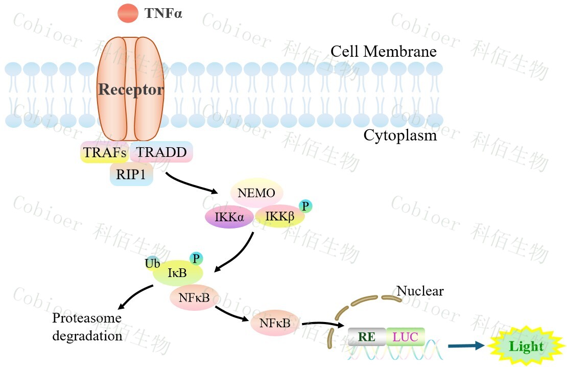 NFκB-Luc THP-1 報(bào)告基因細(xì)胞是由 NFκB 調(diào)控并表達(dá) Luc 熒光素酶報(bào) 告基因的 THP-1 細(xì)胞。TNFα 與受體結(jié)合,激活 NF-κB 的原理見(jiàn)下圖所示。![]() Figure 1. NFκB-Luc THP-1 細(xì)胞模型原理圖