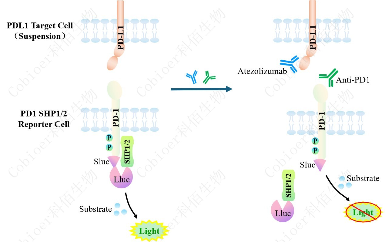 PDL1 Target Cell(Suspension)作為 PD1 SHP1 Reporter Cell 和 PD1 SHP2 Reporter Cell 的靶細胞,藥靶模型很好的模擬了體內(nèi) PD1&SHP1/SHP2 的信號轉(zhuǎn)導(dǎo)過程,原理見下圖所 示。![]() Figure 1. PDL1 Target Cell(Suspension)模型原理圖 |