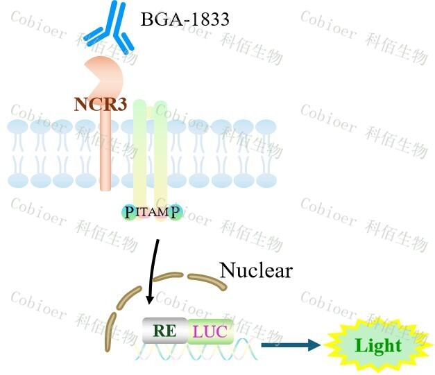 NCR3(NKp30) Effector Reporter 報告基因藥靶模型很好的模擬了體內 NKp30 的信號 轉導過程,原理見下圖所示。![]() Figure 1. NCR3(NKp30) Effector Reporter 細胞模型原理圖 |