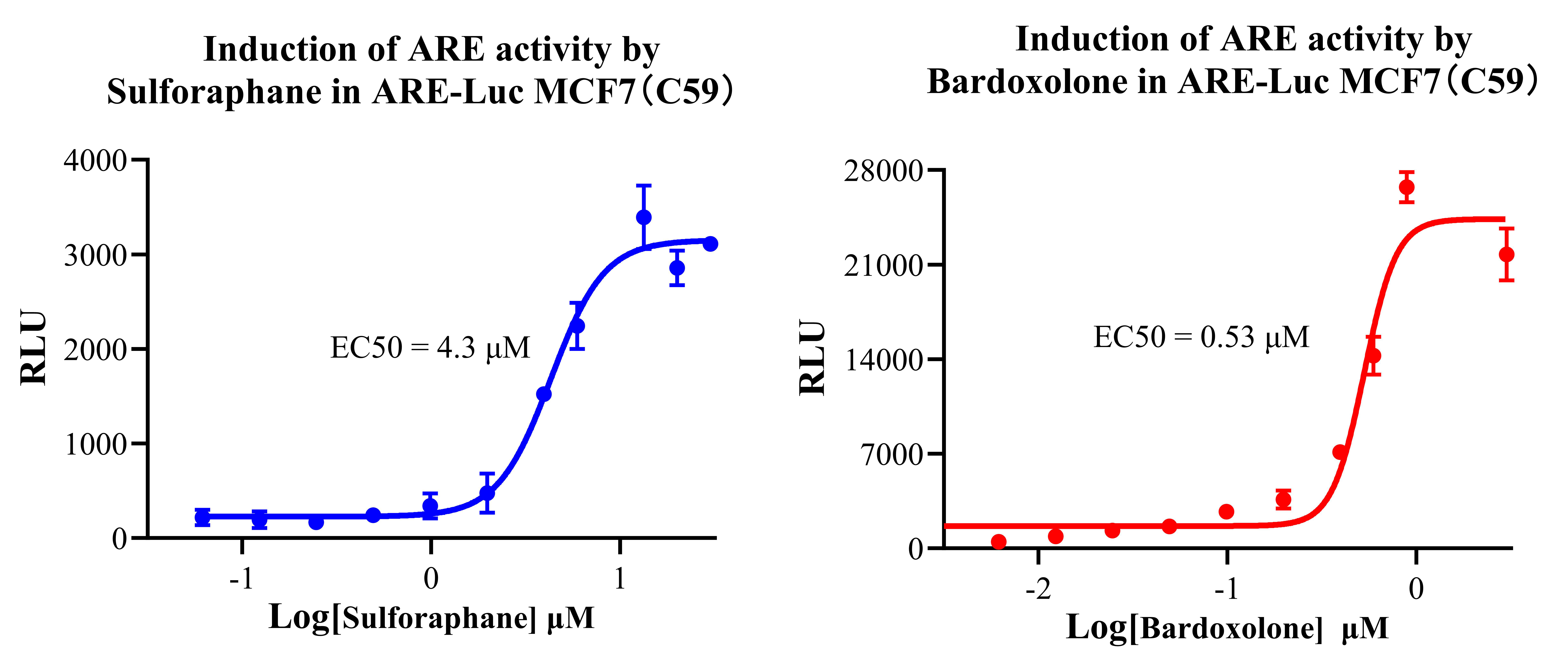 | Figure 2. Induction of ARE activity by Sulforaphane in ARE-Luc MCF7(C59). Induction of ARE activity by Bardoxolone in ARE-Luc MCF7(C59). | |