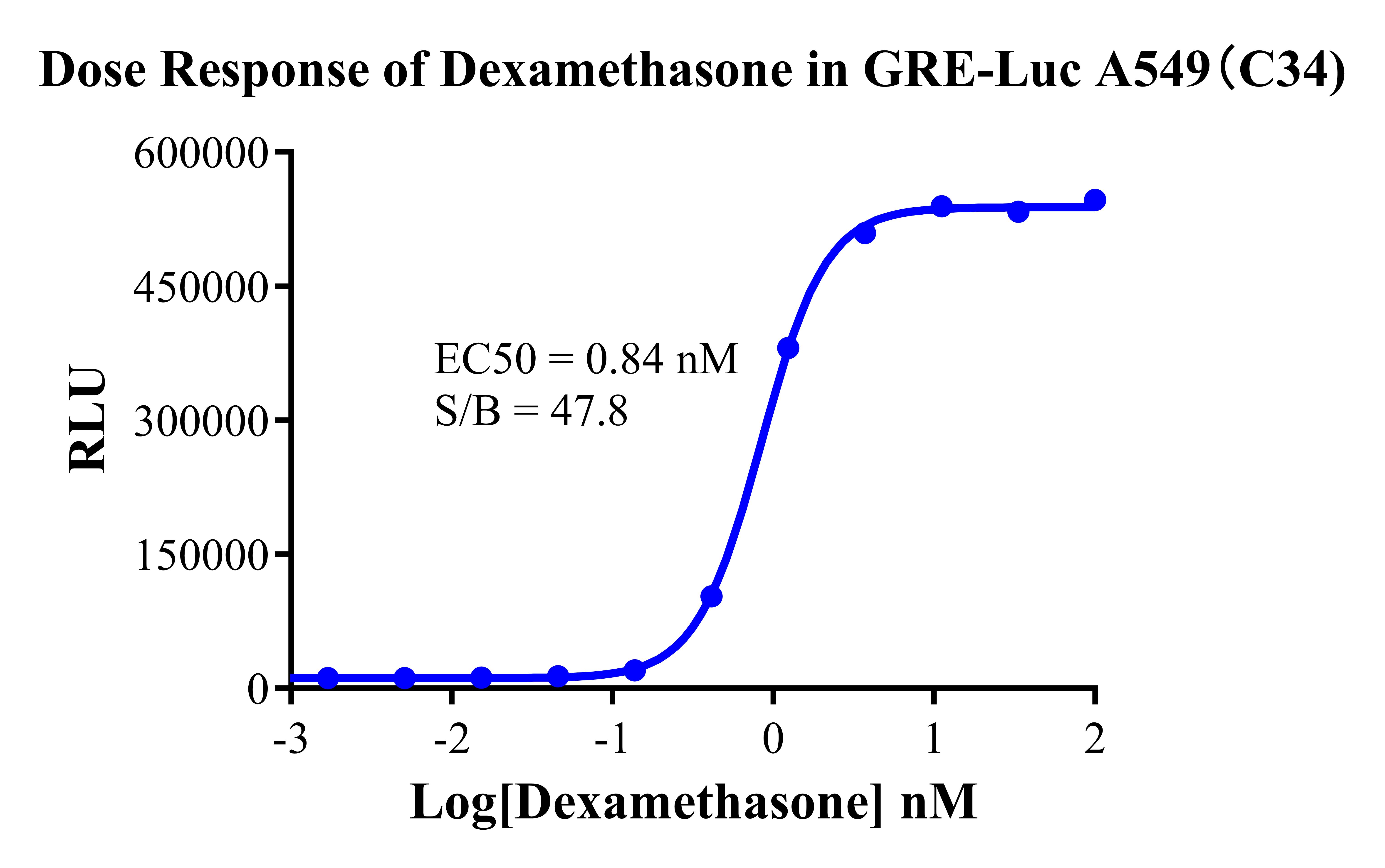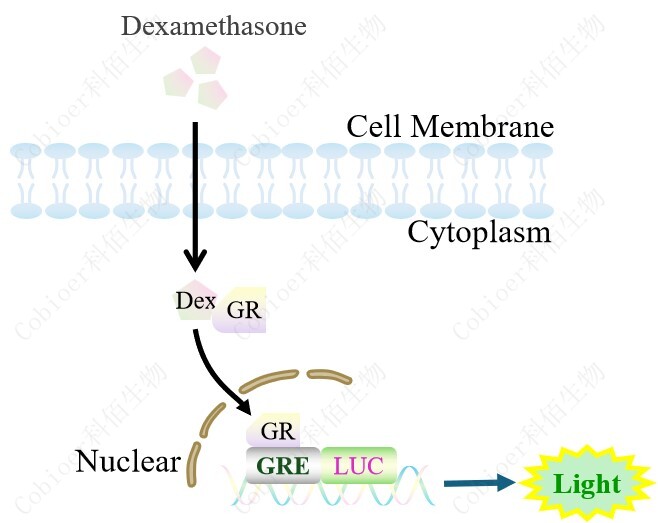 GRE-Luc A549 報(bào)告基因細(xì)胞,是由 GRE 調(diào)控并表達(dá) Luc 熒光素酶報(bào)告 基 因的 A549 細(xì) 胞。 Dexamethasone (Hexadecadrol, 地 塞米 松)是 糖皮質(zhì)激素受體 (Glucocorticoid Receptor)激動(dòng)劑、凋亡誘導(dǎo)劑,原理見(jiàn)下圖所示。![]() Figure 1. GRE-Luc A549 細(xì)胞原理示意圖 |