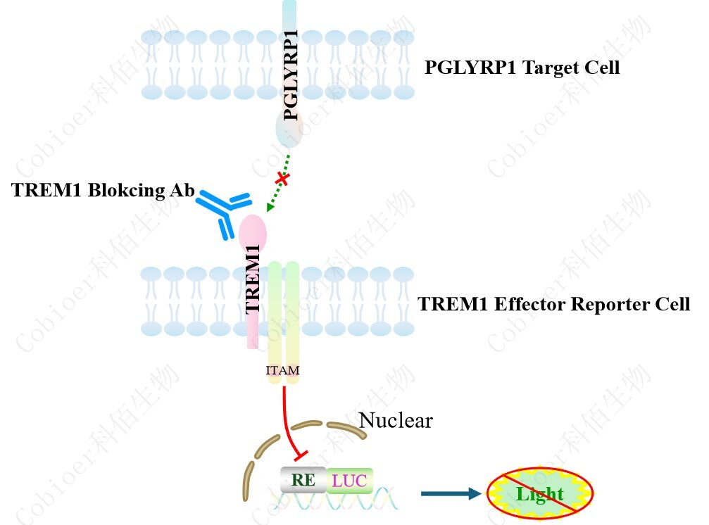 PGLYRP1 Target Cell 作為 TREM1 Effector Reporter Cell 的靶細(xì)胞,很好的模擬了體內(nèi) TREM1 的信號(hào)轉(zhuǎn)導(dǎo)過(guò)程,原理見(jiàn)下圖所示。