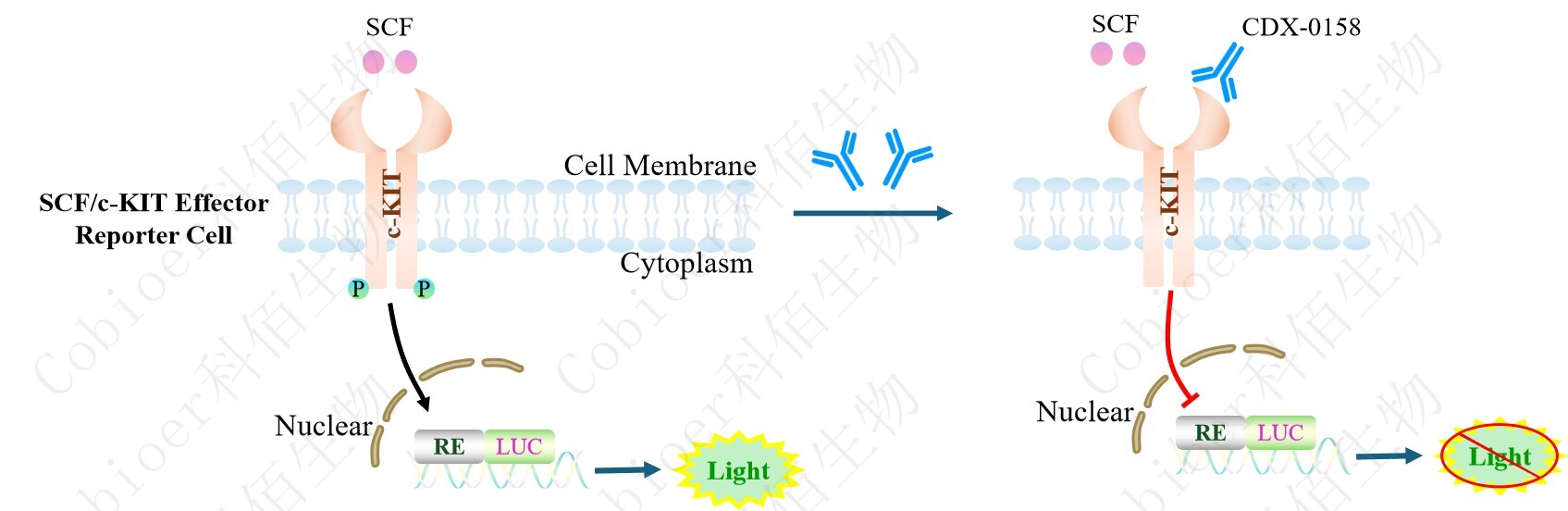 SCF/c-KIT Effector Reporter Cell 報告基因藥靶模型很好的模擬了體內(nèi) SCF/c-KIT 的信號轉導過程,原理見下圖所示。