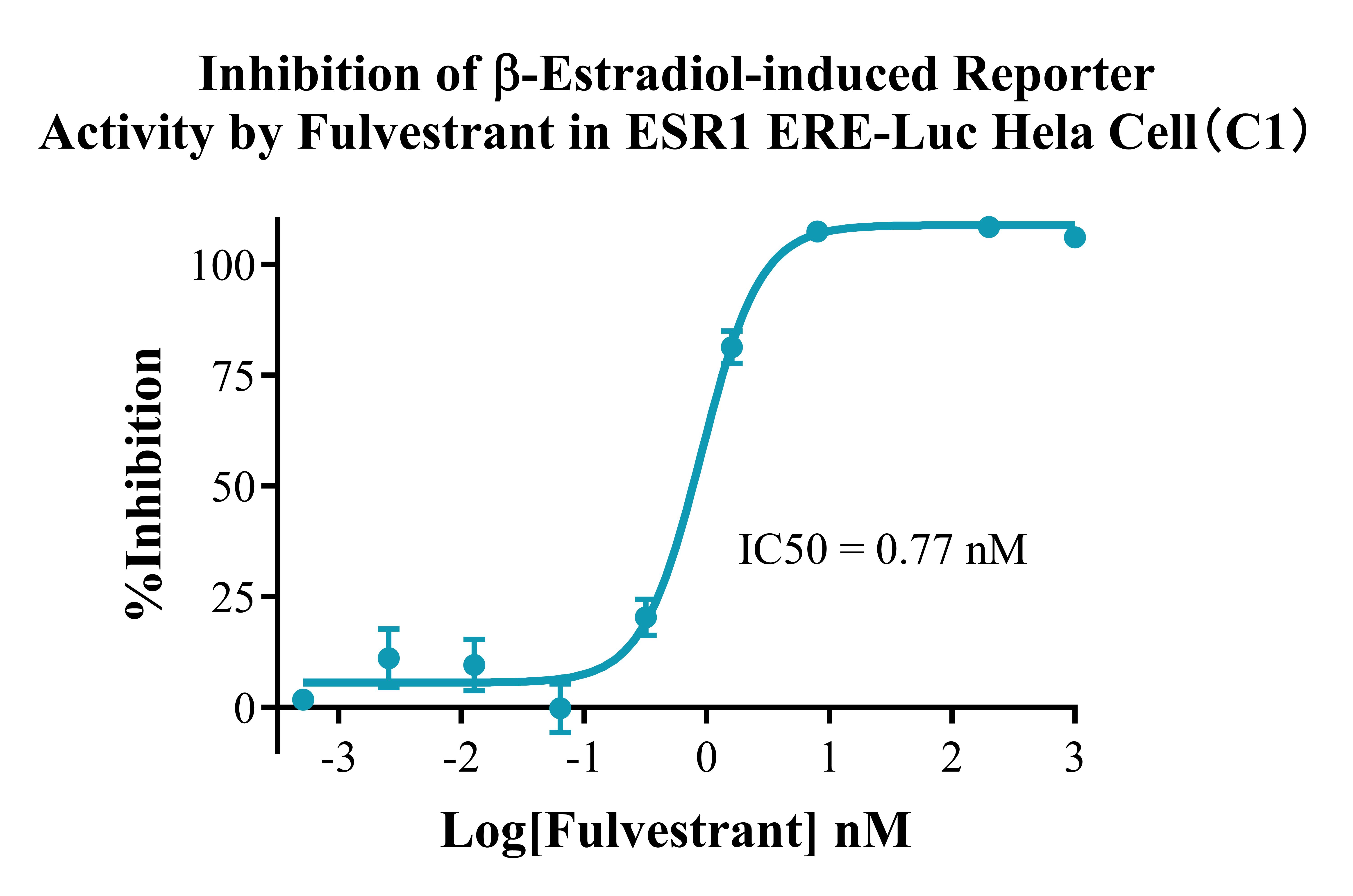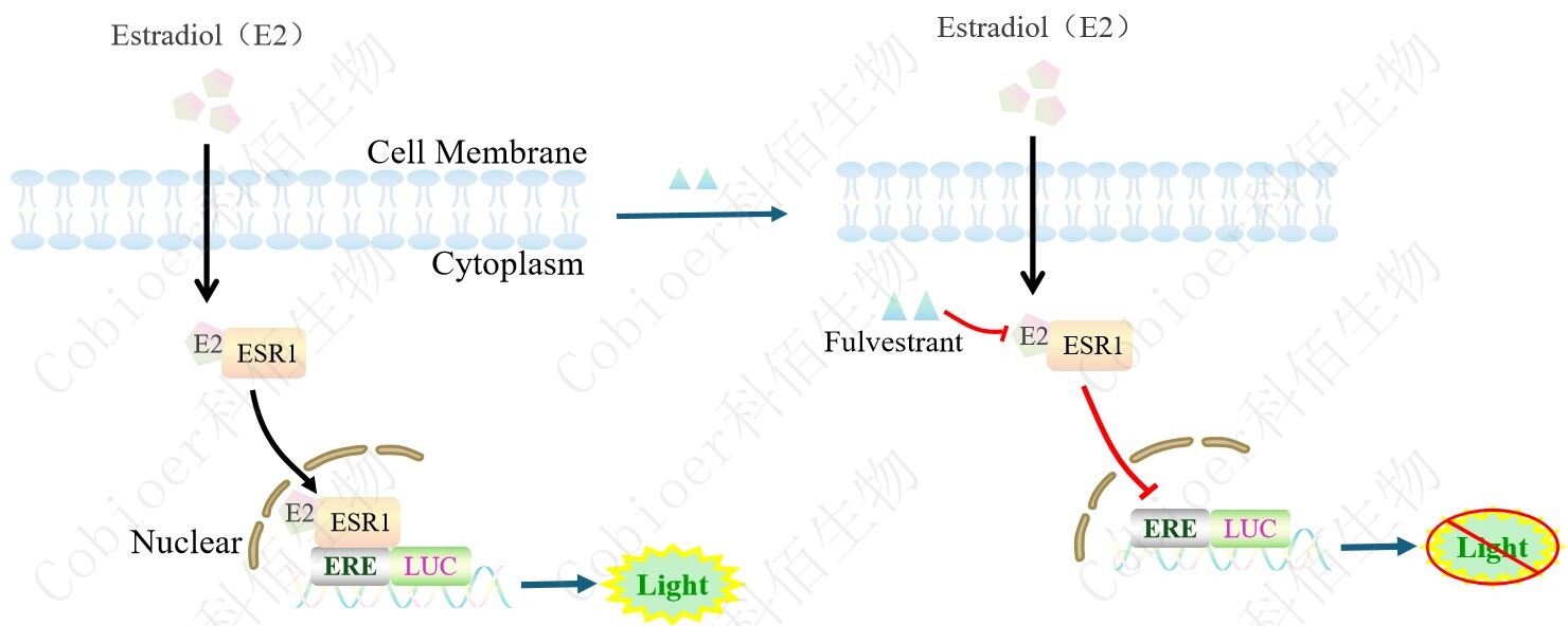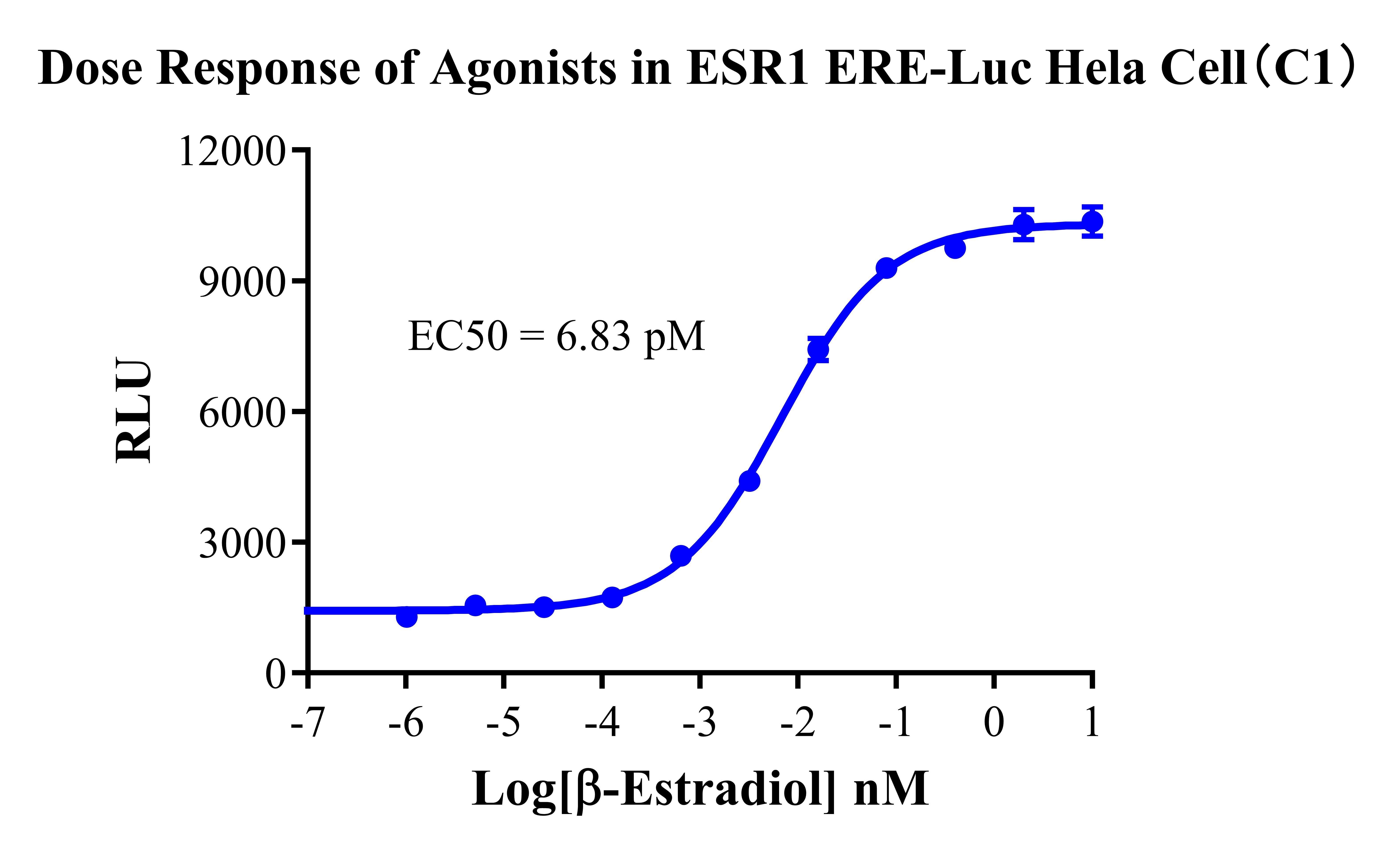 ESR1 ERE-Luc Hela Cell,是由 ERE 調(diào)控并表達 Luc 熒光素酶報告基因 的 Hela 細胞。β-雌二醇(17β-Estradiol,E2)是人體內(nèi)活性最強的雌激素,主要通過結(jié)合 ER 發(fā)揮作用,調(diào)控基因表達和細胞功能,原理見下圖所示。![]() Figure 1. ESR1 ERE-Luc Hela Cell 原理示意圖 |