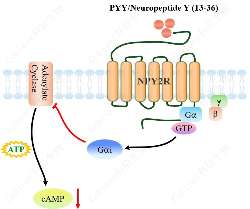 cAMP 在 G 蛋白偶聯(lián)受體(GPCR)信號(hào)轉(zhuǎn)導(dǎo)中是一種關(guān)鍵的第二信使。當(dāng)配體結(jié)合 到 GPCR,構(gòu)象發(fā)生變化,激活受體接著激活 G 蛋白,Gi 的激活導(dǎo)致腺苷酸環(huán)化酶調(diào)控 cAMP 的下調(diào)。NPY2R CHO 藥靶模型很好的模擬了體內(nèi) NPY2R 的信號(hào)轉(zhuǎn)導(dǎo)過(guò)程,原理見 下圖所示。