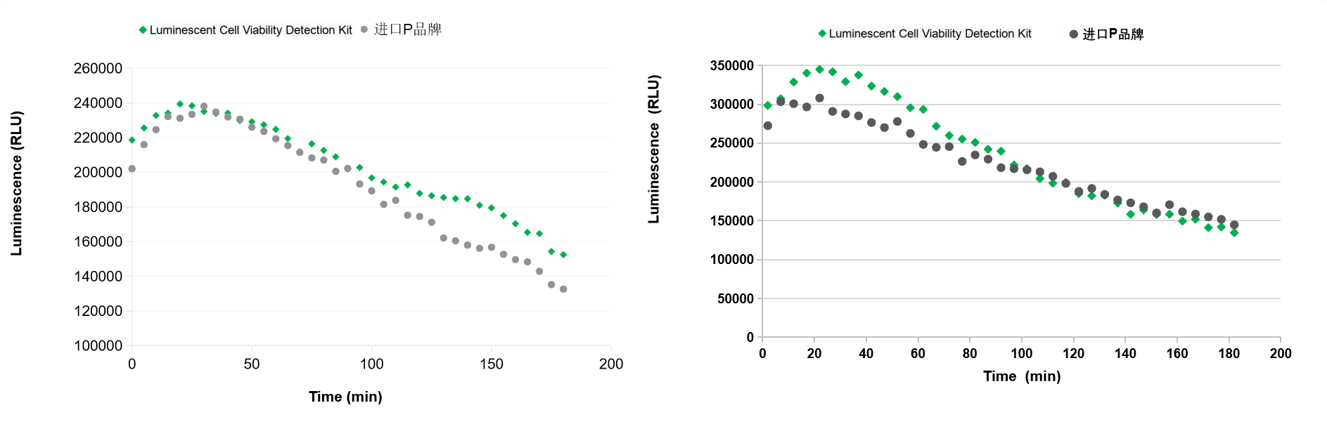 2. 半衰期 ![]() Figure 3. 生物發(fā)光穩(wěn)定性的檢測(cè)。分別使用Luminescent Cell Viability Detection Kit和進(jìn)口P公司同類對(duì)照對(duì)2萬(wàn)個(gè)/孔CTLL-2細(xì)胞(左圖)和5萬(wàn)個(gè)/孔UC-MSC細(xì)胞(右圖)進(jìn)行持續(xù)3小時(shí)的生物發(fā)光強(qiáng)度檢測(cè)。