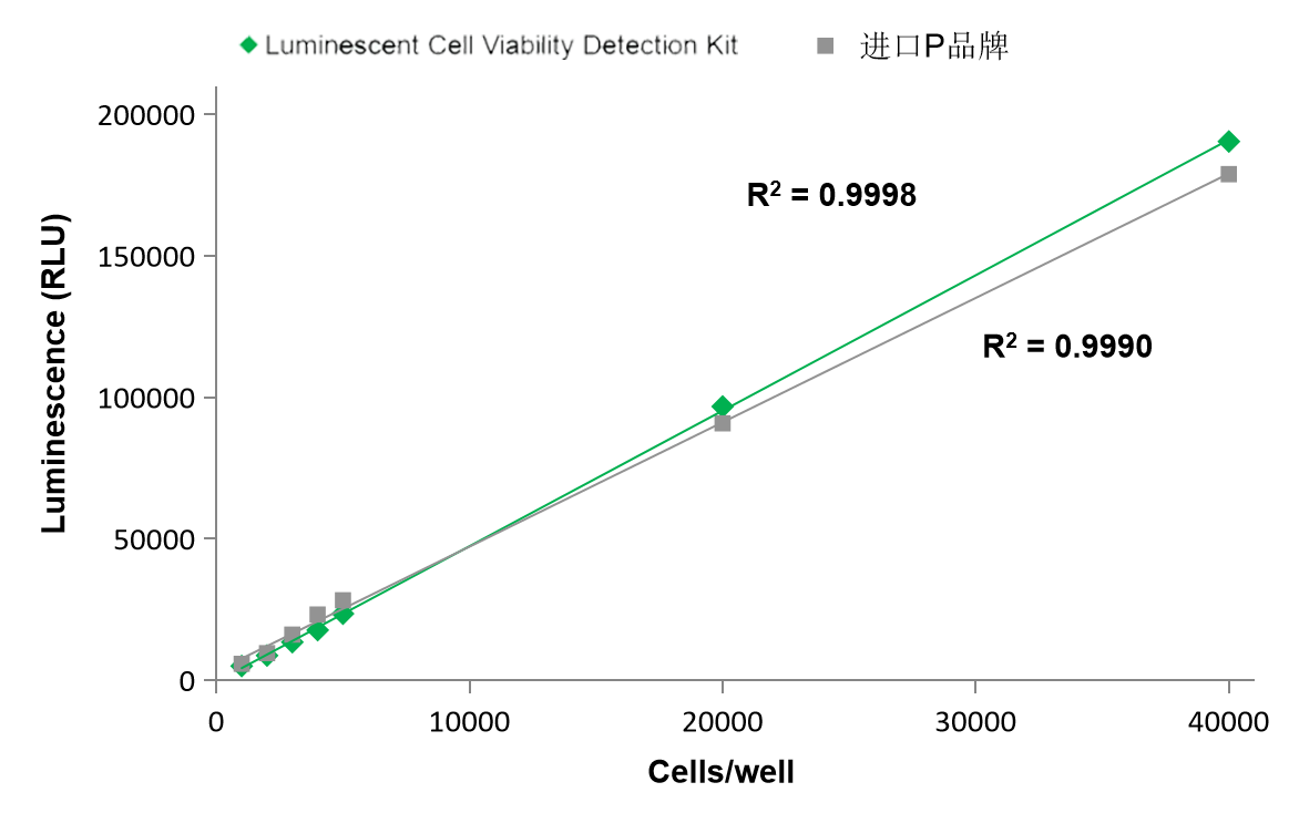 3. 線性 ![]() Figure 4. 比較不同細(xì)胞數(shù)的線性范圍。分別使用Luminescent Cell Viability Detection Kit和進(jìn)口P公司同類對(duì)照檢測(cè)不同數(shù)量CHO-K1細(xì)胞(CD-CHO培養(yǎng)基)在黑色96孔板中生物發(fā)光強(qiáng)度,制成標(biāo)準(zhǔn)曲線。