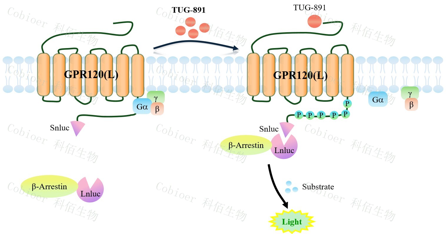 GPR120(L) β-Arrestin CHO 報(bào)告基因藥靶模型很好的模擬了體內(nèi) GPR120(L)/β-Arrestin 的信號(hào)轉(zhuǎn)導(dǎo)過(guò)程,原理見(jiàn)圖 1 所示。當(dāng)缺乏配體刺激時(shí),β-Arrestin 不與 GPR120(L)結(jié)合, 融合β-Arrestin 的熒光素酶處于失活構(gòu)象,當(dāng) GPR120(L)遭遇配體刺激時(shí),融合熒光素酶報(bào) 告基因的β-Arrestin 被招募,使熒光素酶報(bào)告基因處于激活狀態(tài),加入其底物后發(fā)光信號(hào)增 強(qiáng)。![]() Figure 1. GPR120(L) β-Arrestin CHO 細(xì)胞模型原理圖 |