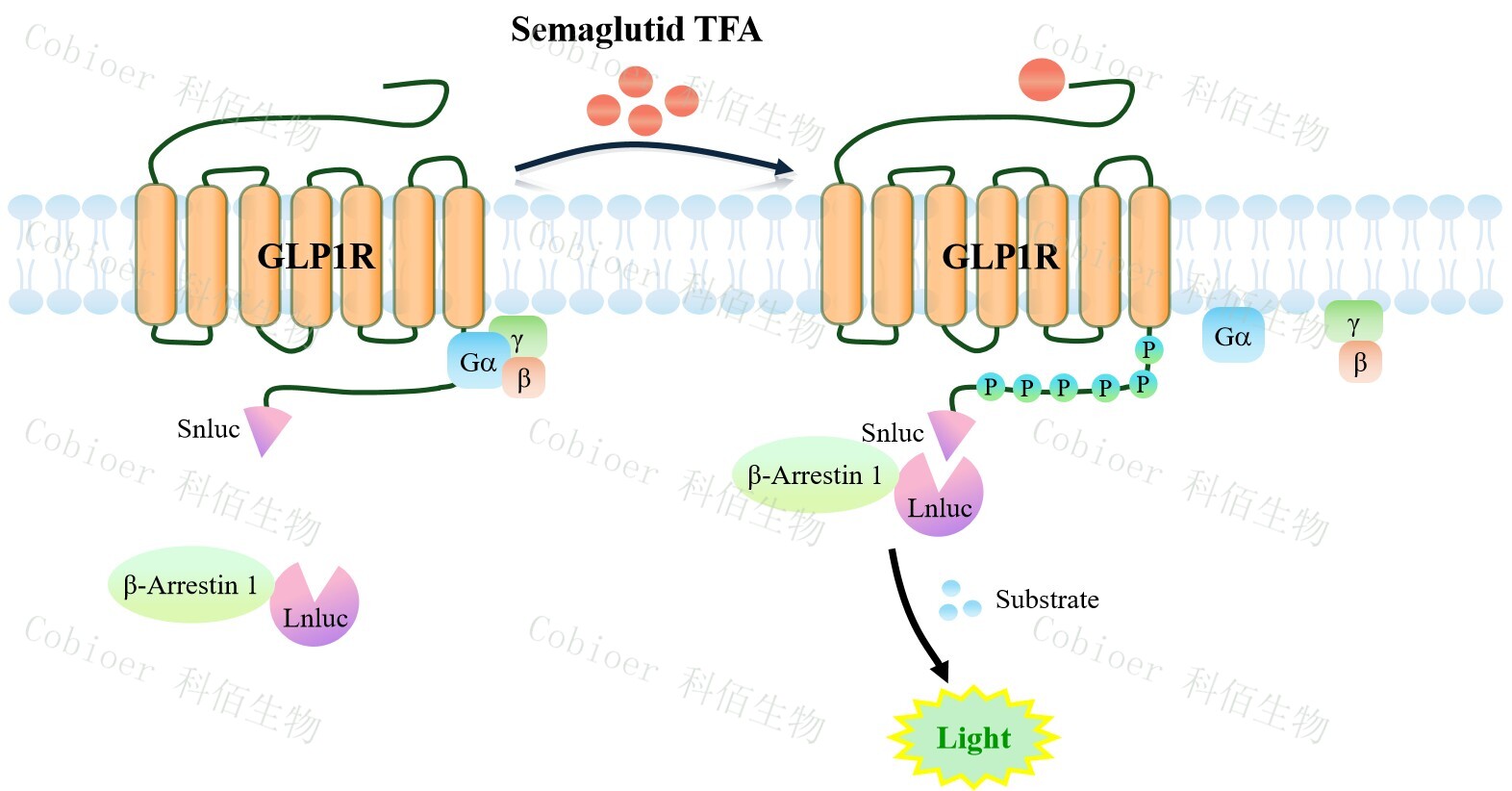 GLP1R β-Arrestin 1 CHO 報(bào)告基因藥靶模型很好的模擬了體內(nèi) GLP1R/β-Arrestin 1 的信 號(hào)轉(zhuǎn)導(dǎo)過程,原理見下圖所示。當(dāng)缺乏配體刺激時(shí),β-Arrestin 1 不與 GLP1R 結(jié)合,融合β- Arrestin 1 的熒光素酶處于失活構(gòu)象,當(dāng) GLP1R 遭遇配體刺激時(shí),融合熒光素酶報(bào)告基因 的β-Arrestin 1 被招募,使熒光素酶報(bào)告基因處于激活狀態(tài),加入其底物后發(fā)光信號(hào)增強(qiáng)。![]() Figure 1. GLP1R β-Arrestin 1 CHO 細(xì)胞模型原理圖 |
