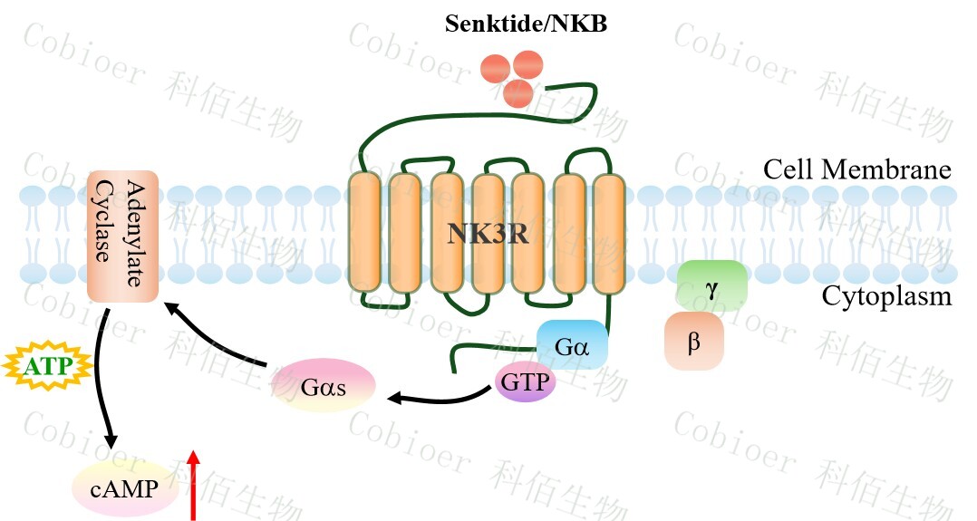 | 速激肽(Tachykinin)是在整個神經(jīng)和免疫系統(tǒng)中表達(dá)的神經(jīng)肽,作為興奮性神經(jīng)遞質(zhì), 它們在調(diào)節(jié)各種生理功能中發(fā)揮重要的作用。在不同的速激肽中,P 物質(zhì)(SP)、神經(jīng)激 肽 A(NKA) 和 NKB 已得到充分研究。這些肽可以通過三種不同的 GPCR、神經(jīng)激肽 1 受體(NK1R)、神經(jīng)激肽 2 受體(NK2R) 和 NK3R 發(fā)揮作用。作為具有不同親和力的 完全激動劑。 NK3R(Neurokinin 3 Receptor),又稱 TACR3,是速激肽受體家族的重要成員,屬于 GPCR 超家族。其內(nèi)源性配體為神經(jīng)激肽 B(Neurokinin B, NKB),通過激活下游信號通 路參與生殖調(diào)控、神經(jīng)內(nèi)分泌調(diào)節(jié)及多種疾病進(jìn)程。近年來,NK3R 成為治療更年期癥狀、 神經(jīng)精神疾病及癌癥的熱門靶點。 |