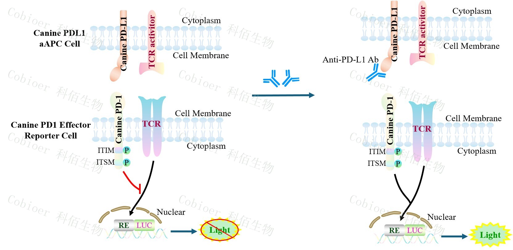 Canine PD1 Effector Reporter Cell 報(bào)告基因藥靶模型很好的模擬了體內(nèi) PD1&PDL1 的 信號(hào)轉(zhuǎn)導(dǎo)過(guò)程,原理圖見(jiàn)下圖所示。![]() Figure 1. Canine PD1 Effector Reporter Cell 細(xì)胞模型原理圖