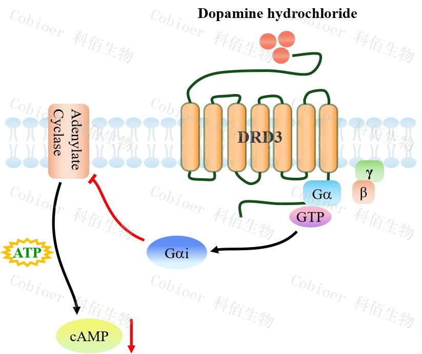 | 多巴胺(DA)是一種主要的兒茶酚胺神經(jīng)遞質(zhì),它與多巴胺受體(DRs)結(jié)合,因此 在中樞神經(jīng)系統(tǒng)(CNS)中起著重要作用,包括睡眠、工作記憶、情緒、學(xué)習(xí)等。DRs 是 由 DRD1、DRD2、DRD3、DRD4 和 DRD5 組成的 G 蛋白偶聯(lián)受體,根據(jù)它們對(duì)腺苷酸環(huán) 化酶(AC)活性的不同調(diào)節(jié)作用,分為 D1 樣受體(DRD1 和 DRD5)和 D2 樣受體(DRD 2、DRD3 和 DRD4)。 D2 樣受體與 Go 和 Gi 蛋白偶聯(lián),它們參與 AC 的失活,導(dǎo)致胞質(zhì)內(nèi) cAMP 水平降低。 DA 與 D2 樣受體的結(jié)合抑制 cAMP/PKA 信號(hào)通路,最終影響 CREB 磷酸化。DRD3 主要分 布于中樞神經(jīng)系統(tǒng)的邊緣區(qū)域,調(diào)控情緒及運(yùn)動(dòng)功能,是精神分裂癥、藥物成癮及帕金森 病的重要治療靶點(diǎn)。 | |