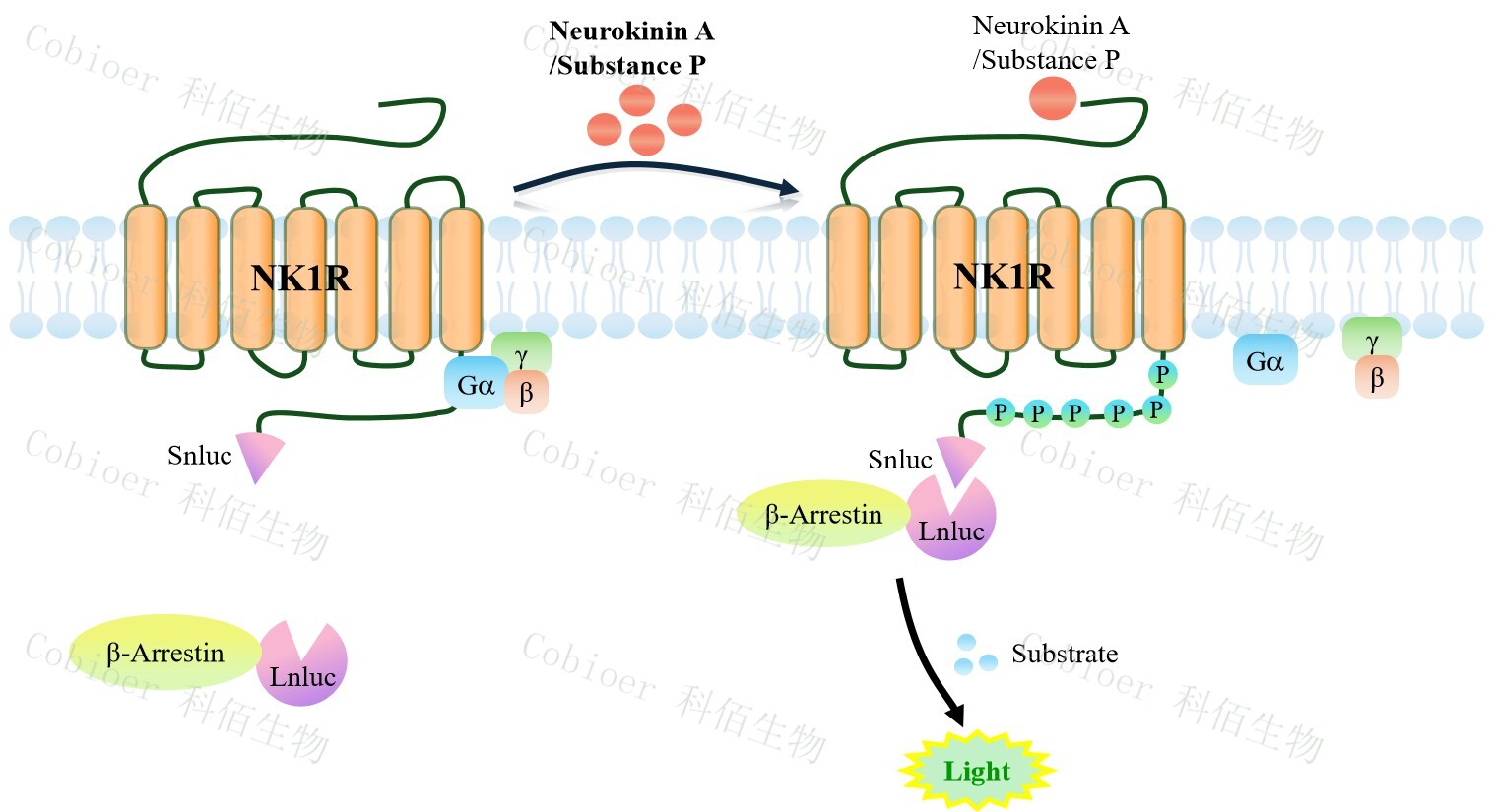 NK1R β-Arrestin CHO 報告基因藥靶模型很好的模擬了體內(nèi) NK1R/β-Arrestin 的信號轉 導過程,原理見下圖所示。當缺乏配體刺激時,β-Arrestin 不與 NK1R 結合,融合β-Arrestin的熒光素酶處于失活構象,當 NK1R 遭遇配體刺激時,融合熒光素酶報告基因的β-Arrestin 被招募,使熒光素酶報告基因處于激活狀態(tài),加入其底物后發(fā)光信號增強。![]() Figure 1. NK1R β-Arrestin CHO 細胞模型原理圖 |