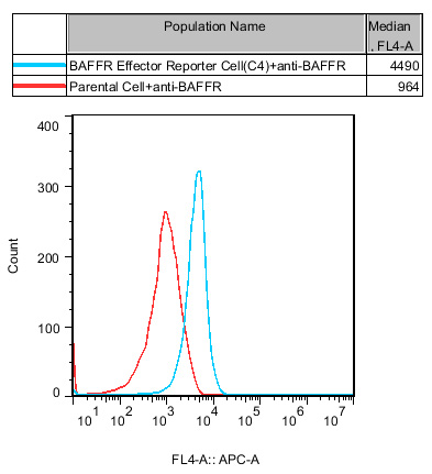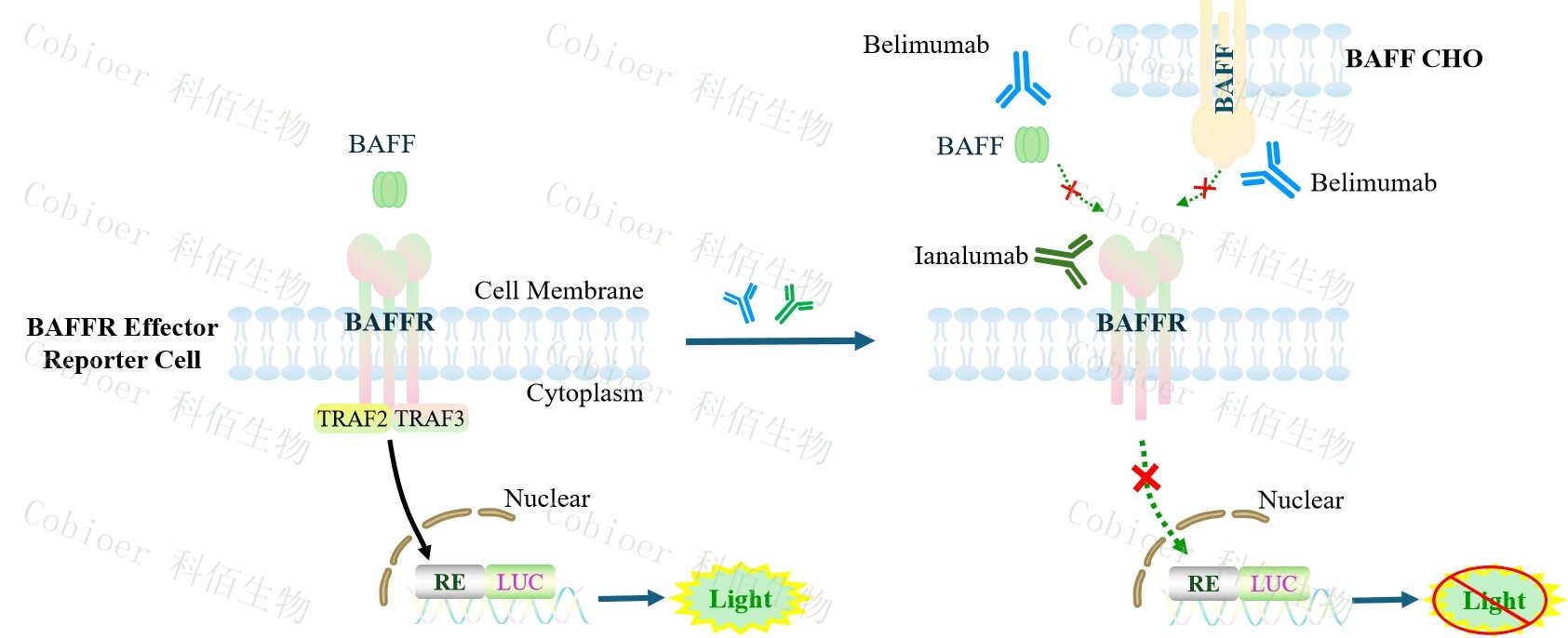 BAFFR Effector Reporter Cell 報告基因藥靶模型很好的模擬了體內(nèi) BAFF 的信號轉(zhuǎn)導(dǎo)過程,原理見下圖所示。![]() Figure 1. BAFFR Effector Reporter Cell 細胞模型原理圖 |