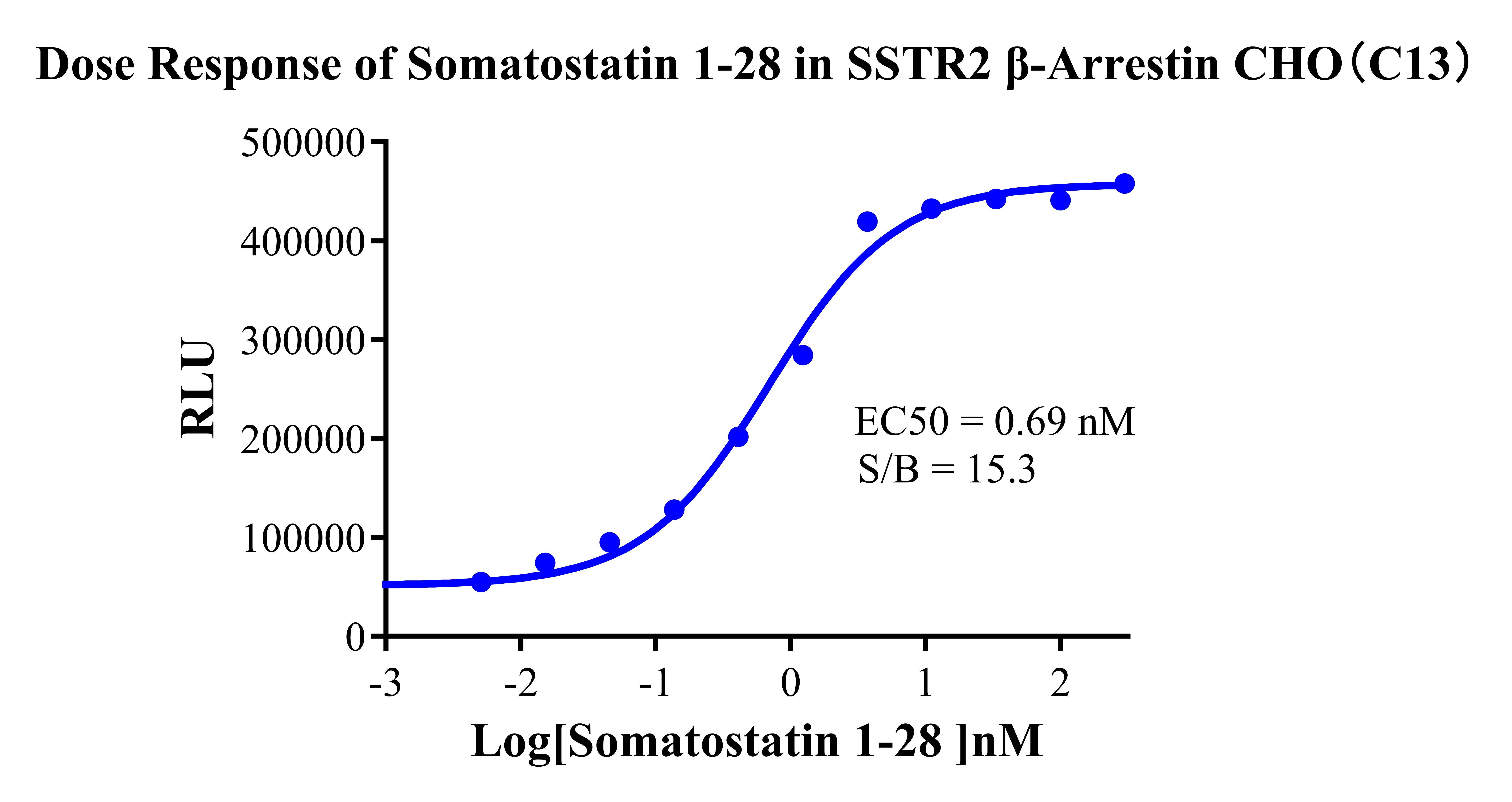 SSTR2 β-Arrestin CHO 報告基因藥靶模型很好的模擬了體內(nèi) SSTR2/β-Arrestin 的信號 轉(zhuǎn)導(dǎo)過程,原理見下圖所示。當缺乏配體刺激時,β-Arrestin 不與 SSTR2 結(jié)合,融合β- Arrestin 的熒光素酶處于失活構(gòu)象,當 SSTR2 遭遇配體刺激時,融合熒光素酶報告基因的 β-Arrestin 被招募,使熒光素酶報告基因處于激活狀態(tài),加入其底物后發(fā)光信號增強。
