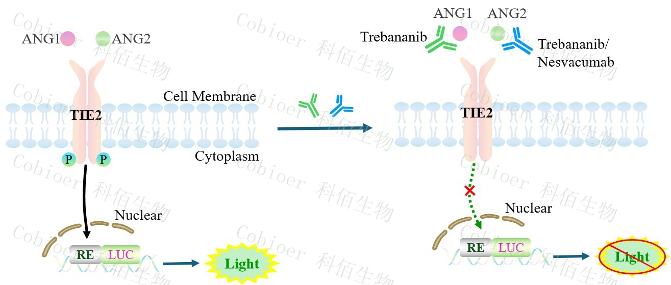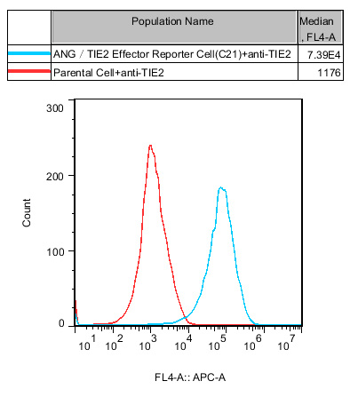 ANG/TIE2 Effector Reporter Cell 報告基因藥靶模型很好的模擬了體內(nèi) ANG/TIE2 的信 號轉(zhuǎn)導(dǎo)過程,原理見下圖所示。![]() Figure 1. ANG/TIE2 Effector Reporter Cell 細胞模型原理圖