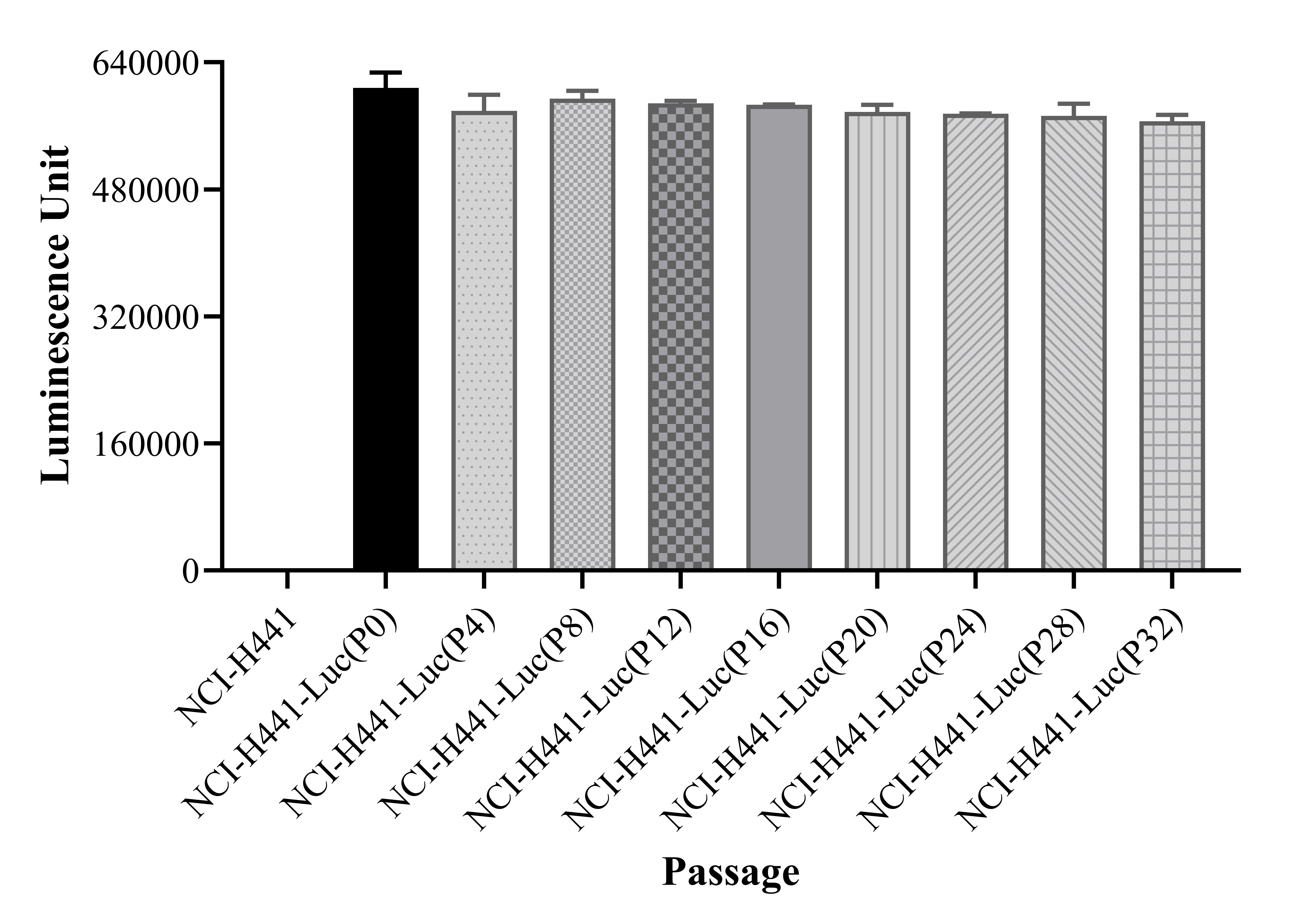 Figure 1. Stablity test results. NCI-H441-Luc showed at least 32 passage stability with similar luminescence unit. |