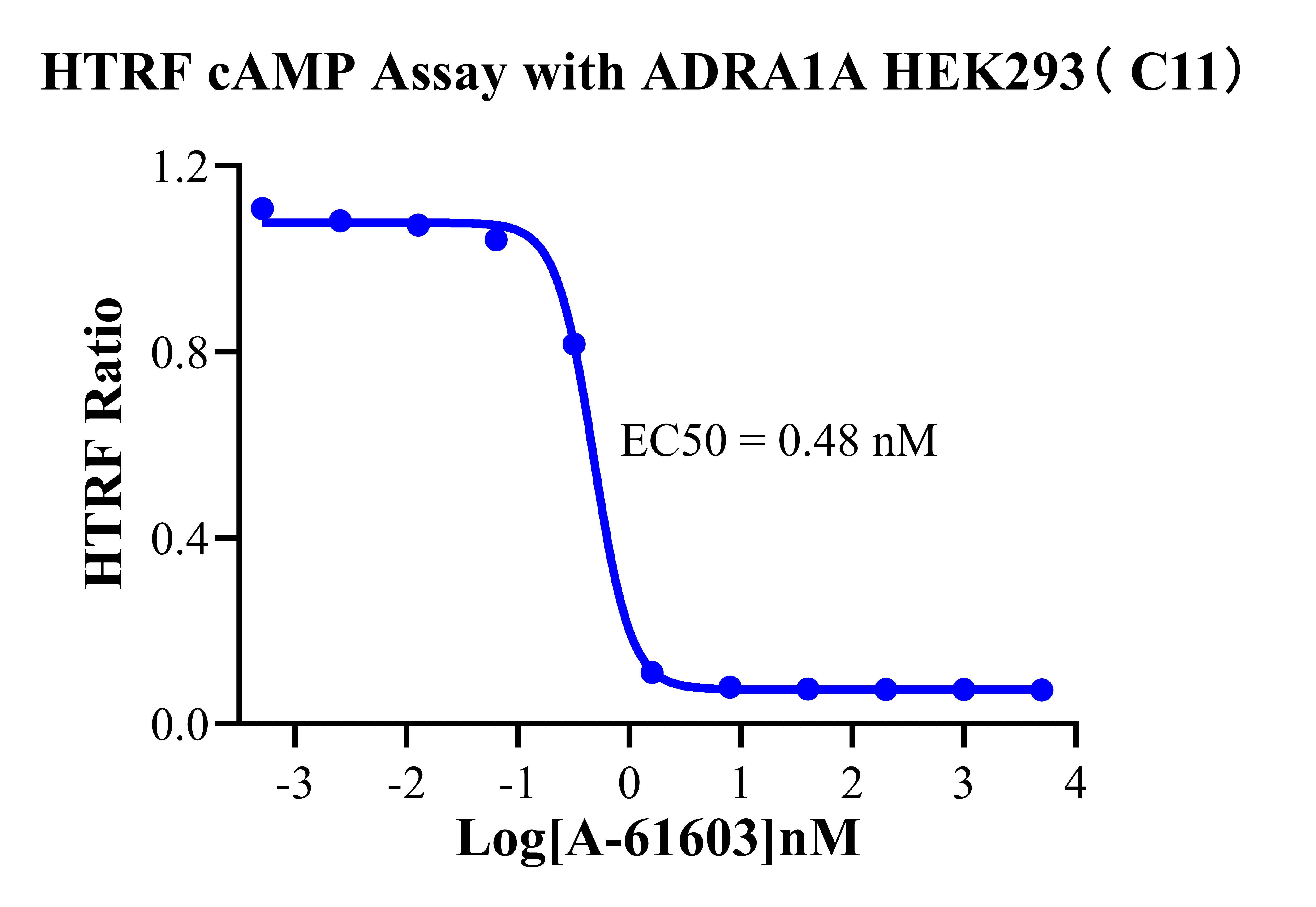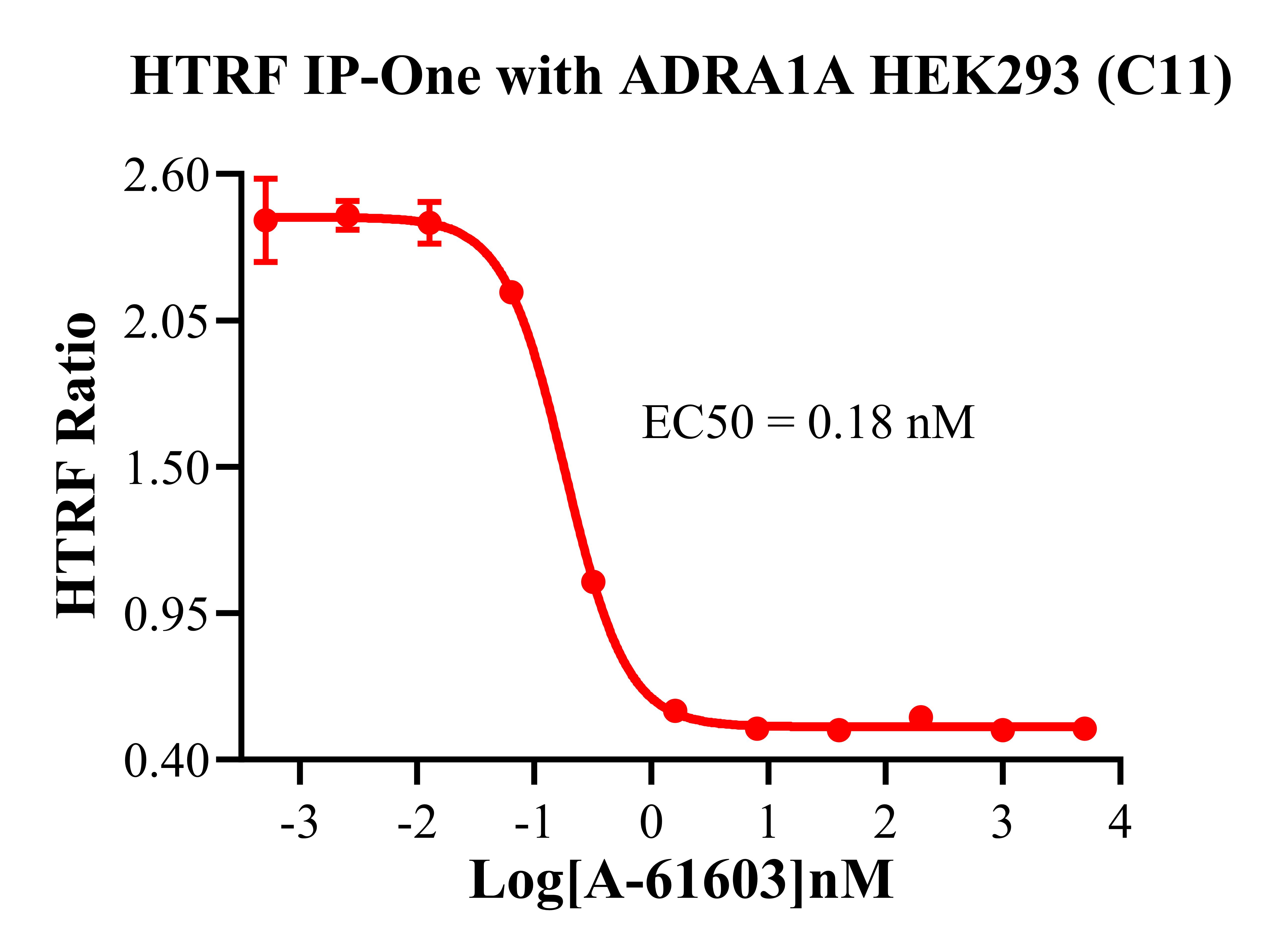 ADRA1A 還可以通過 Gq 蛋白的信號通路,調(diào)控 IP1 的升高。ADRA1A 與配體結(jié)合, 導(dǎo)致 Gαq 亞基的激活,觸發(fā) PLC-γ,從而產(chǎn)生兩個第二信使:IP3 和 DAG,它們參與細(xì)胞 內(nèi)鈣動員。由于 IP3 在代謝上不穩(wěn)定,因此測量通路激活的替代標(biāo)志物 IP1 作為檢測標(biāo)準(zhǔn)。