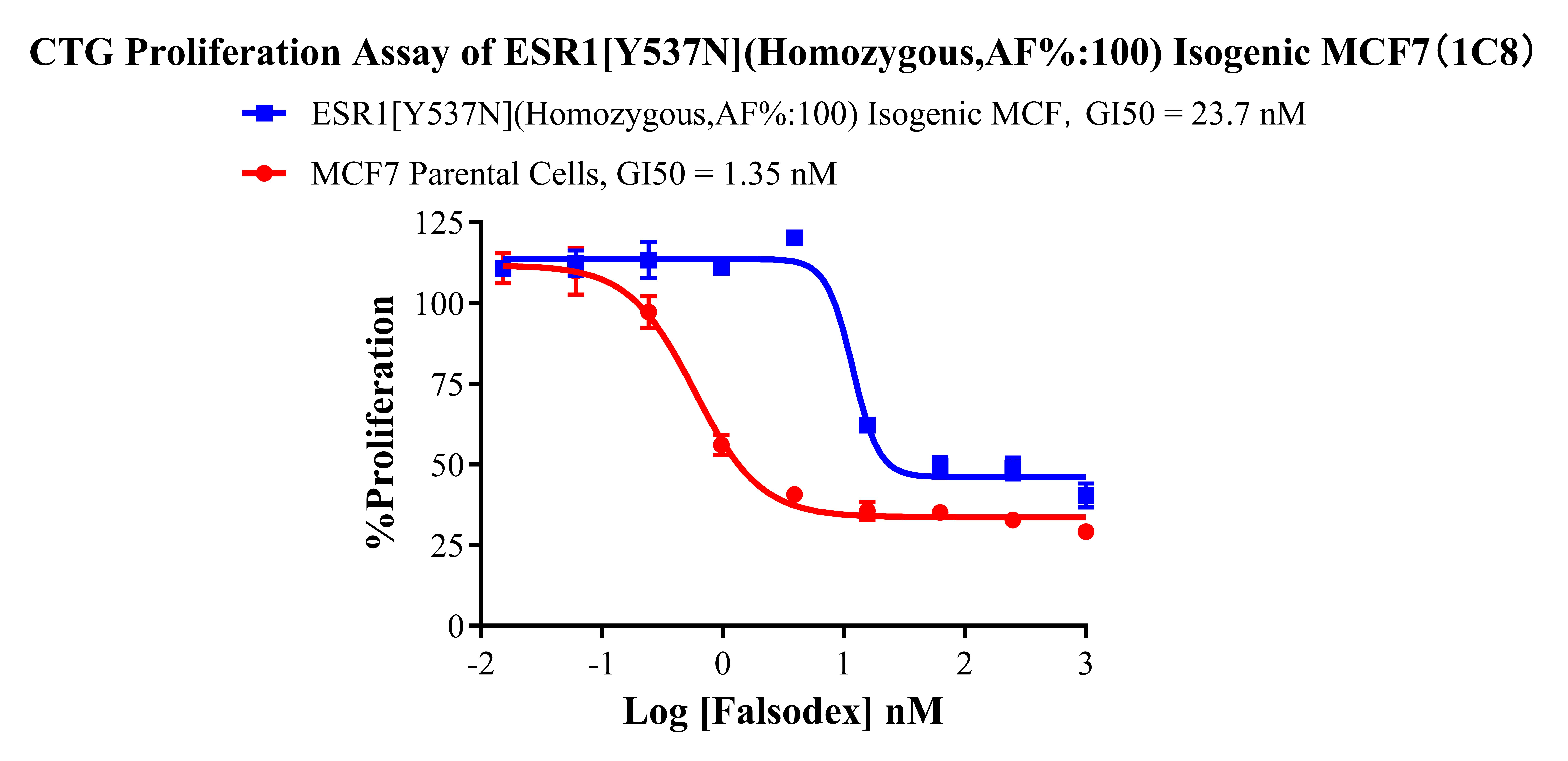 ![]() Figure 2. Sanger of ESR1[Y537N](Homozygous,AF%:100) Isogenic MCF7. ![]() Figure 3. A:MCF7 Parental Cell;B:ESR1[Y537N](Homozygous,AF%:100) Isogenic MCF7 通道2 藍色微滴代表ESR1[Y537N]突變陽性,通道2 綠色微滴代表該位點為陰性野生型 ![]() Figure 4. CTG Proliferation Assay of ESR1[Y537N(Homozygous,AF%:100) Isogenie MCF7(1C8). |