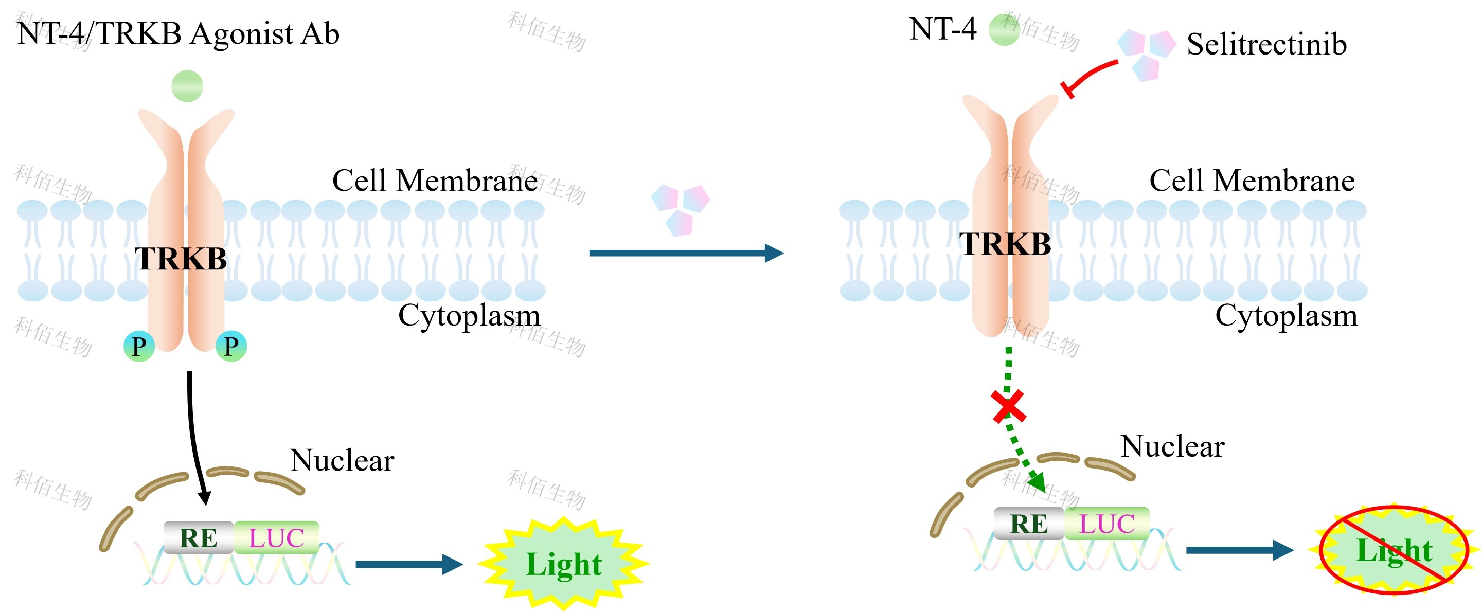 TRKB Effector Reporter Cell 報(bào)告基因藥靶模型很好的模擬了體內(nèi) TRKB 的信號轉(zhuǎn)導(dǎo)過程,原理見下圖所示。![]() Figure 1. TRKB Effector Reporter Cell 模型原理圖 |