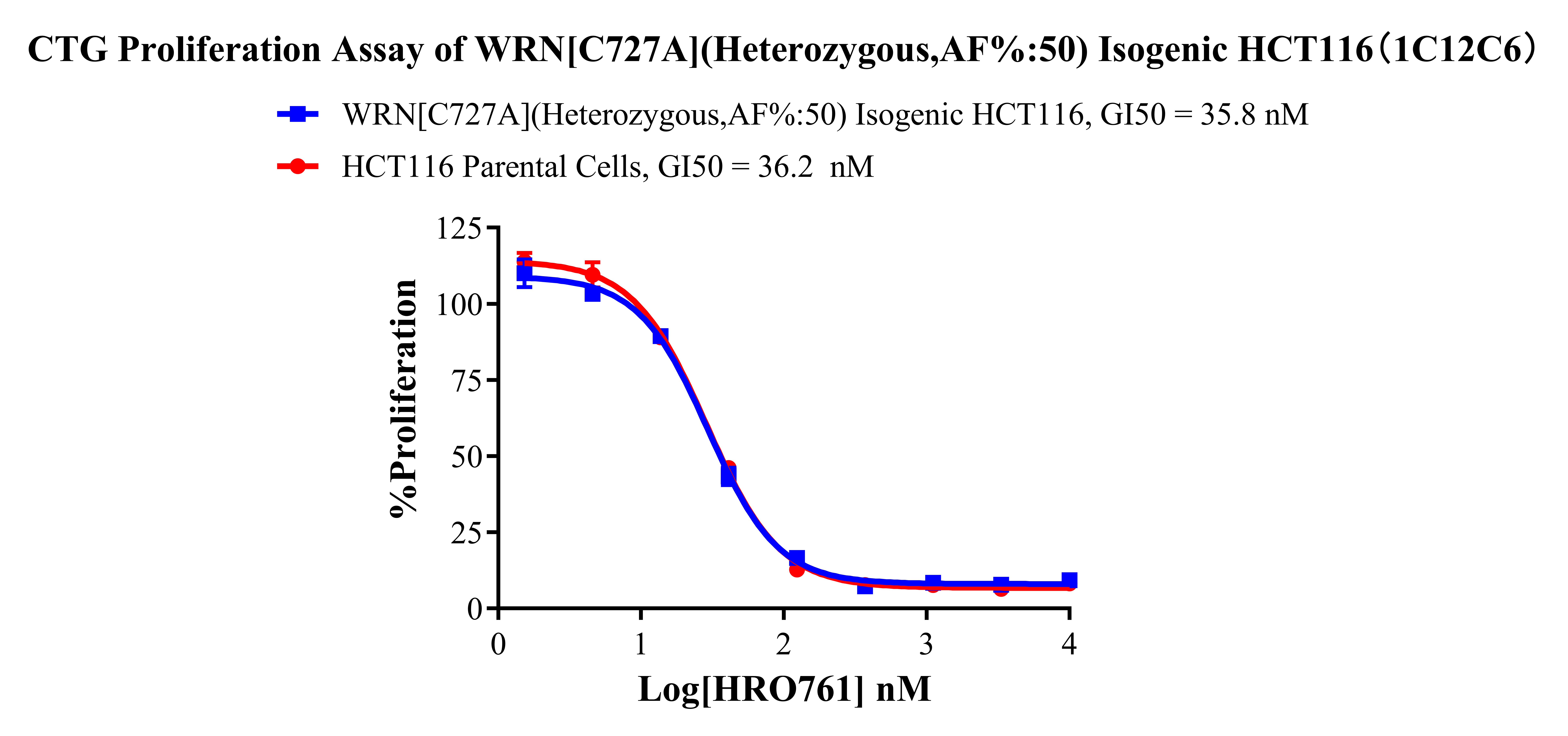 Figure 2. Sanger of WRN[C727A](Heterozygous,AF%:50) Isogenic HCT116![]() Figure 3. A:HCT116 Parental Cell;B:WRN[C727A](Heterozygous,AF%:50) Isogenic HCT116 通道2 藍(lán)色微滴代表WRN[C727A]突變陽(yáng)性,通道2 綠色微滴代表該位點(diǎn)為陰性野生型 ![]() Figure 4. CTG Proliferation Assay of WRN[C727A](Heterozygous,AF%:50) Isogenic HCT116(1C12C6). ![]() Figure 5. CTC Proliferation Assay of WRN[C727A](Heterozygous,AF%:50) lsogenic HCT116(1C12C6). |