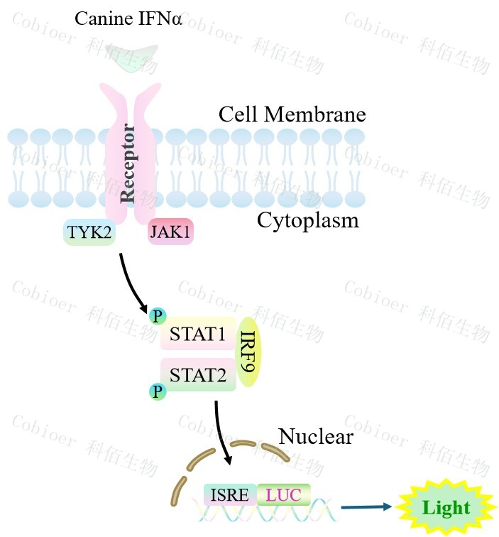 Canine IFNα&β Effector Reporter Cell 報(bào)告基因細(xì)胞,是由調(diào)控因子調(diào)控 并表達(dá) Luc 熒光素酶報(bào)告基因的重組細(xì)胞。IFNα與受體結(jié)合,激活 ISRE 的原理見下圖所示。![]() Figure 1. Canine IFNα&β Effector Reporter Cell 細(xì)胞模型原理圖 |