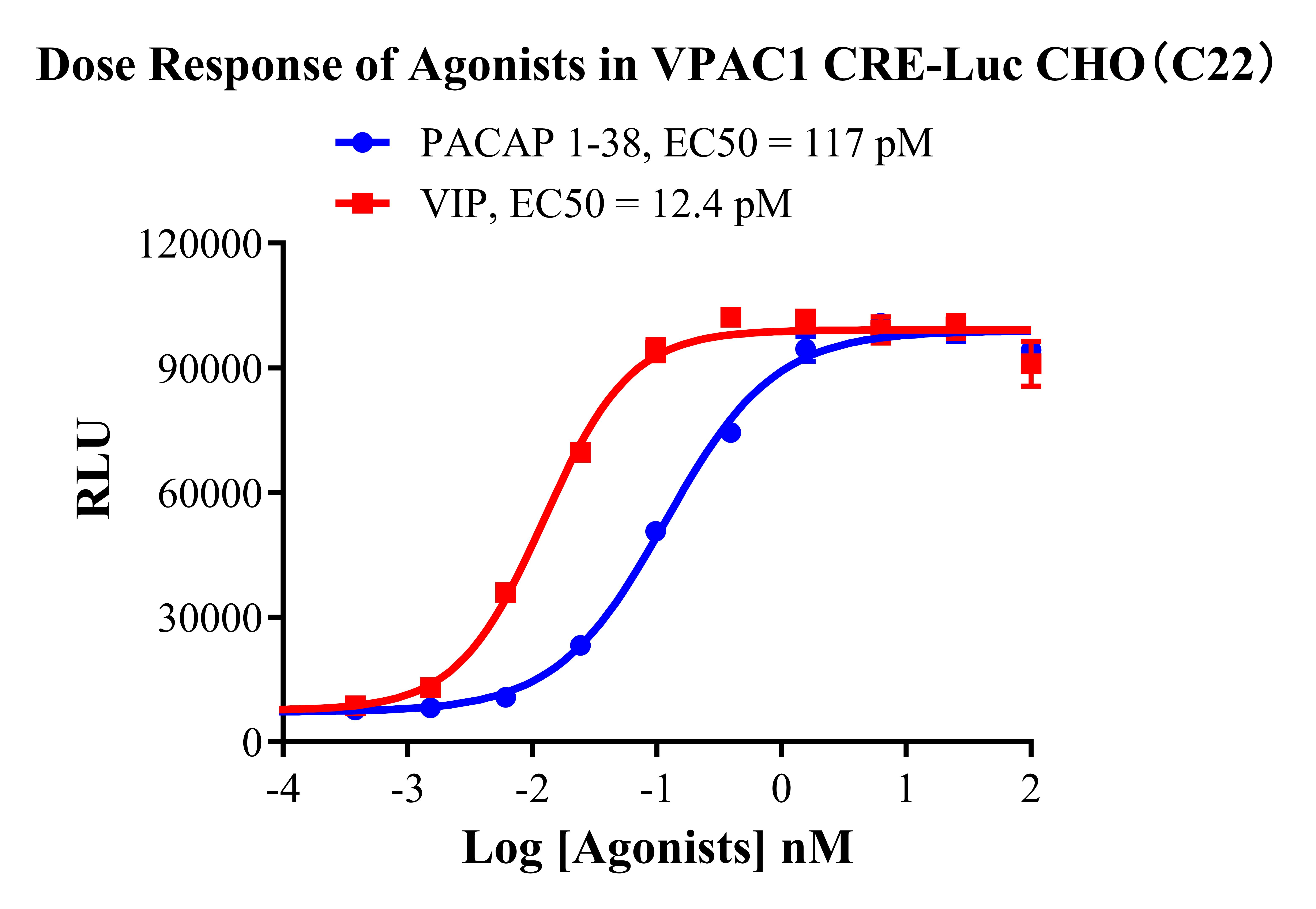 VPAC1 CRE-Luc CHO 報告基因藥靶模型很好的模擬了體內(nèi) VPAC1 的信號轉(zhuǎn)導(dǎo)過程, 原理見下圖所示。![]() Figure 1. VPAC1 CRE-Luc CHO 細胞模型原理圖 |