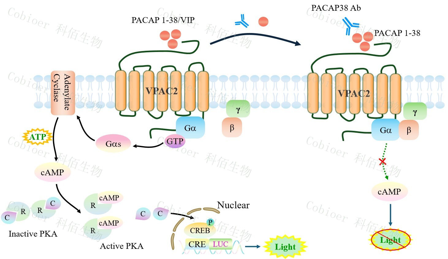 | PACAP/VIP 受體家族屬于 B 類 G 蛋白偶聯(lián)受體(GPCR),包含 PAC1R (PAC1)、 VPAC1R (VPAC1) 和 VPAC2R (VPAC2) 三個(gè)亞型,共同響應(yīng)神經(jīng)肽 PACAP(垂體腺苷酸 環(huán)化酶激活肽)和 VIP(血管活性腸肽)的調(diào)控,通過激活 Gs/cAMP-PKA 核心信號(hào)軸 (部分亞型偶聯(lián) Gq/PLC)廣泛協(xié)調(diào)神經(jīng)內(nèi)分泌、代謝穩(wěn)態(tài)與免疫調(diào)節(jié)。 VPAC2 受體(血管活性腸肽受體 2 型)作為 B 類 GPCR 的核心亞型,主要富集于下丘 腦視交叉上核(SCN)、胰腺β細(xì)胞、脂肪組織及骨細(xì)胞,以同等高親和力結(jié)合 VIP 和 PACAP,通過 Gs/cAMP-PKA 通路調(diào)控代謝穩(wěn)態(tài)與晝夜節(jié)律。VPAC2 的激活可同步 SCN 生物鐘基因(如 Per2)振蕩以維持睡眠-覺醒周期、促進(jìn)胰島素/胰高血糖素脈沖式分泌調(diào) 控血糖平衡、抑制破骨細(xì)胞分化并增強(qiáng)骨形成。 | |