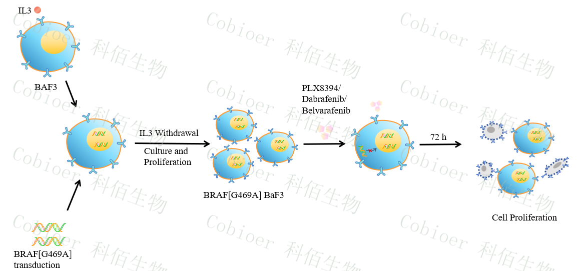 BaF3(小鼠原 B 細胞)的生長和增殖需要 IL-3 的維持。通過引入各種表達激酶的基因, 能作為 BaF3 的驅(qū)動基因,讓 BaF3 不再依賴 IL-3 而增殖,進而激酶基因成為 BaF3 增殖依 賴的驅(qū)動基因,用于評估小分子藥物對激酶的靶向抑制作用,原理及流程見下圖所示。