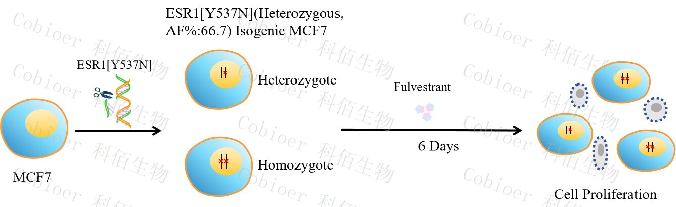 ESR1[Y537N](Heterozygous,AF%66.7) Isogenic MCF7 藥靶細(xì)胞,通過(guò)基 因編輯的方式將 ESR1 的 537 位氨基酸酪氨酸(Y)突變?yōu)樘於0罚∟)。![]() Figure 1. ESR1[Y537N](Heterozygous,AF%66.7) Isogenic MCF7 原理示意圖 |