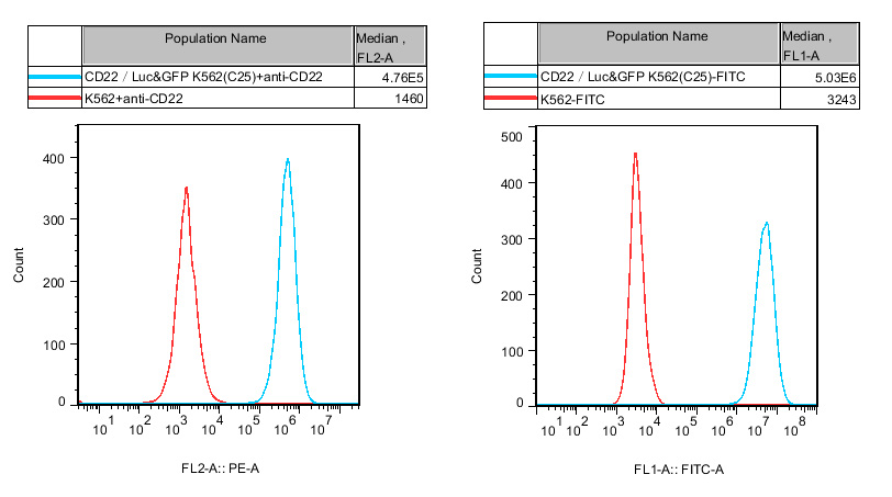 ![]() Figure 1. Recombinant CD22/Luc &GFP K562 stably expressing CD22.
