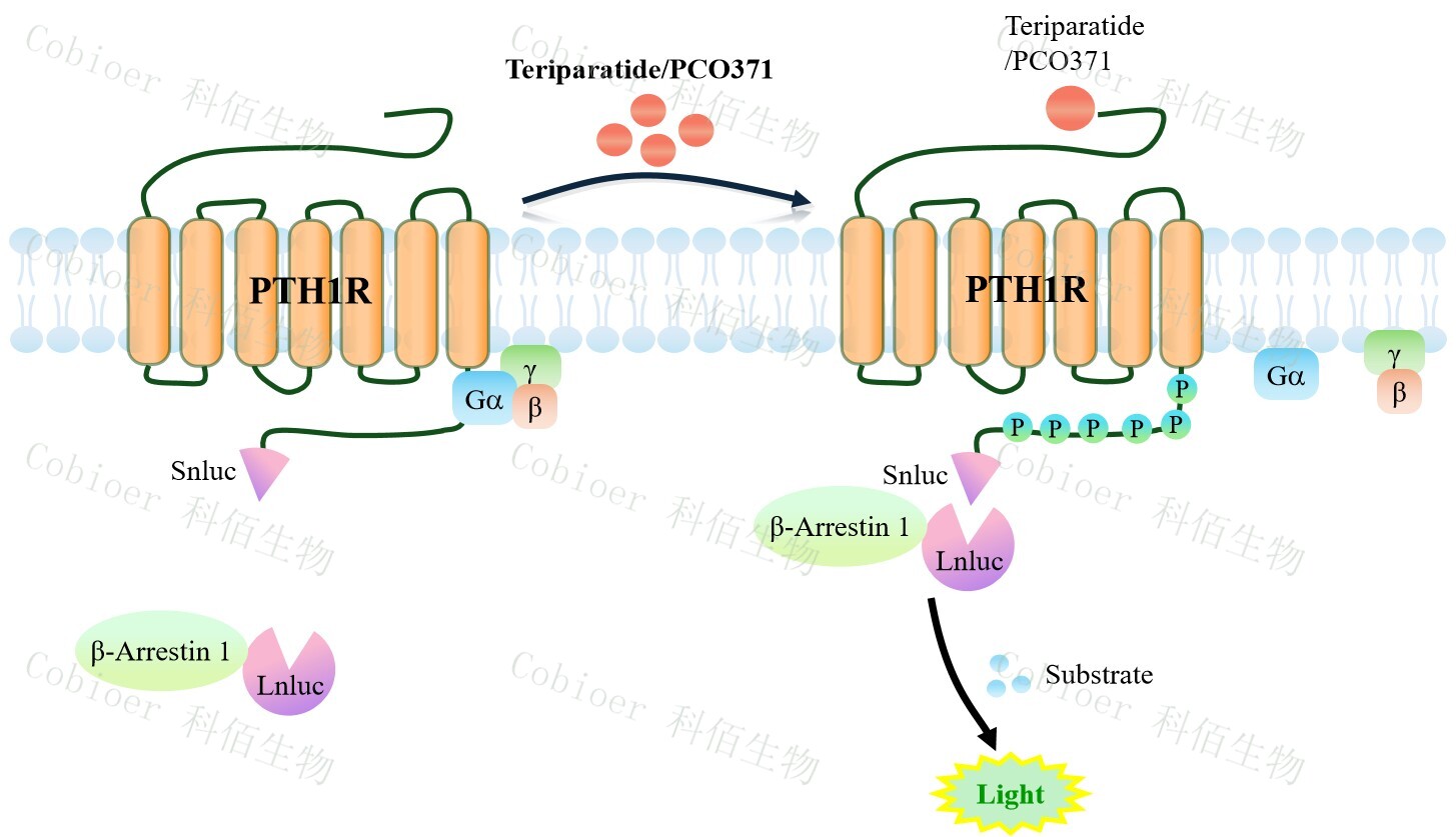 PTH1R β-Arrestin 1 CHO 報告基因藥靶模型很好的模擬了體內 PTH1R/β-Arrestin 1 的信號轉導過程,原理見下圖所示。當缺乏配體刺激時,β-Arrestin 1 不與 PTH1R 結合,融合β- Arrestin 1 的熒光素酶處于失活構象,當 PTH1R 遭遇配體刺激時,融合熒光素酶報告基因 的β-Arrestin 1 被招募,使熒光素酶報告基因處于激活狀態(tài),加入其底物后發(fā)光信號增強。![]() Figure 1. PTH1R β-Arrestin 1 CHO 細胞模型原理圖 |